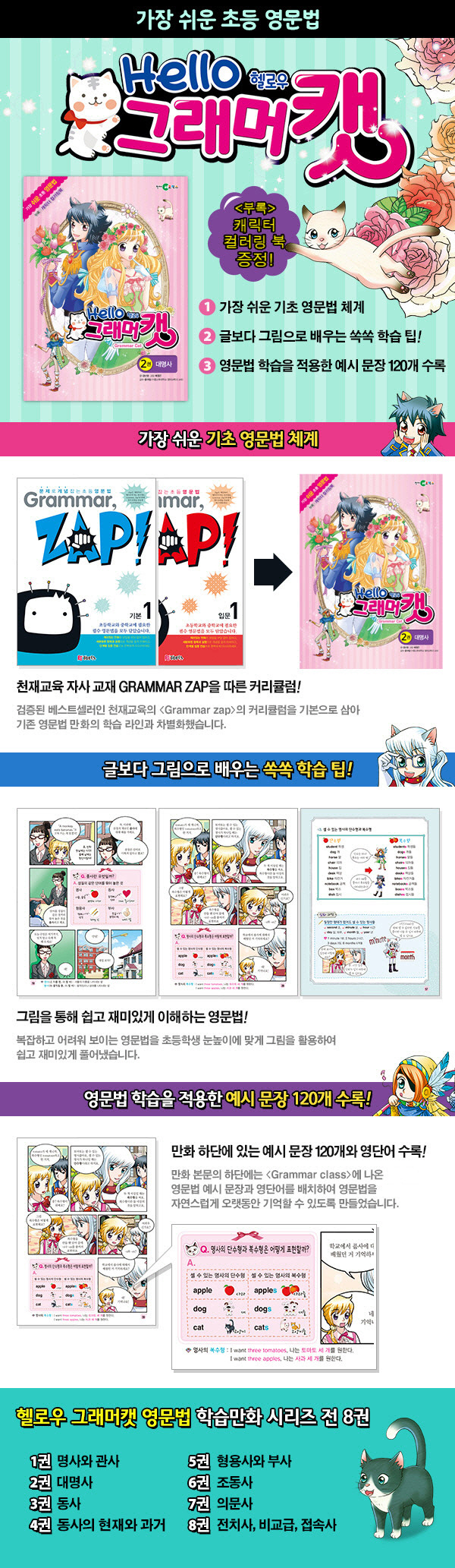 °¡Àå ½¬¿î ÃÊµî ¿µ¹®¹ý ¡ºÇï·Î¿ì ±×·¡¸Ó Ĺ¡»Á¦2±Ç ¡¶´ë¸í»ç¡·. ¸í»ç¿Í °ü»ç¸¦ ¹è¿î 1±Ç¿¡ À̾î À̹ø¿¡´Â ´ë¸í»çÀÇ ÇнÀ¶óÀÎÀ» ¹è¿ï ¼ö ÀÖ´Ù. »ýȰ ¼Ó ½ÇÁ¦ ÇÊ¿äÇÑ »óȲ¿¡ ÁÖÀΰøµéÀ» ³ëÃâÇÏ¿© ¿µ¹®¹ýÀ» ¿Ö, ¾î¶»°Ô °øºÎÇØ¾ß ÇÏ´ÂÁö¿¡ ´ëÇÑ µ¿±â ºÎ¿©ÇÑ´Ù. ¸¸È º»¹®ÀÇ ÆäÀÌÁö ÇÏ´Ü¿¡´Â ¡¶Grammar class¡·¿¡ ³ª¿Â ¿µ¹®¹ý ¿¹½Ã ¹®ÀåÀ» ¹Ýº¹ÀûÀ¸·Î ¹èÄ¡ÇØ ÀÚ¿¬½º·´°Ô ±â¾ïÇÒ ¼ö ÀÖµµ·Ï ¹è·ÁÇß´Ù. ¶ÇÇÑ ±Ç¸»¿¡´Â ¸¸È¿¡¼ ¹è¿î ³»¿ëÀ» ´Ù½Ã ÇÑ ¹ø Á¤¸®ÇÒ ¼ö ÀÖ´Â °³³äÁ¤¸®¿Í ¹®¹ýÀ» Àڱ⠰ÍÀ¸·Î ¸¸µé ¼ö ÀÖ´Â Å×½ºÆ®¸¦ Á¦°øÇÑ´Ù.