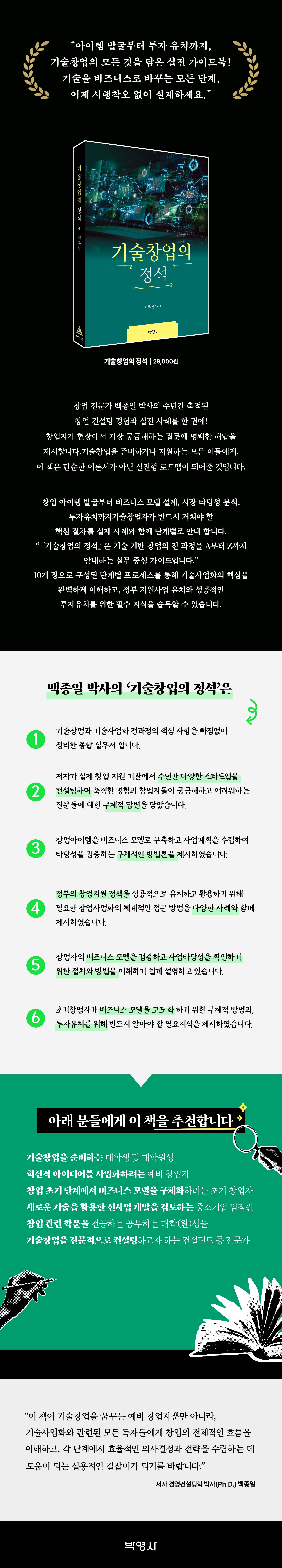 ÀÌ Ã¥ÀÇ ¶Ç ´Ù¸¥ Ư¡Àº ½Ç¹« ÇöÀå¿¡¼ °ËÁõµÈ ³»¿ëÀ» ¹ÙÅÁÀ¸·Î ±¸¼ºµÇ¾ú´Ù´Â Á¡ÀÌ´Ù. ÀúÀÚ°¡ ½ÇÁ¦ â¾÷ Áö¿ø ±â°ü¿¡¼ ¼ö³â°£ ´Ù¾çÇÑ ½ºÅ¸Æ®¾÷À» ÄÁ¼³ÆÃÇϸç ÃàÀûÇÑ °æÇè°ú, ´ëÇп¡¼ â¾÷ °ü·Ã ±³°ú¸ñ ¼ö¾÷À» ÁøÇàÇÏ¸é¼ ÇлýµéÀÌ °¡Àå ±Ã±ÝÇØÇÏ°í ¾î·Á¿öÇÏ´Â Áú¹®µé¿¡ ´ëÇÑ ±¸Ã¼Àû ´äº¯À» ´ã¾Ò´Ù. ¶ÇÇÑ ½Ê¿© ³â°£ °ø°øºÎ¹®ÀÇ Ã¢¾÷ ±³À°±â°ü °ÀÇ ÇöÀå¿¡¼ °ËÁõµÈ ±³À° ÄÜÅÙÃ÷¸¦ ¹ÙÅÁÀ¸·Î ÁýÇÊÇÏ¿´´Ù. ÀúÀÚ°¡ ÁýÇÊÇÑ Çѱ¹±â¾÷¡¤±â¼ú°¡Ä¡Æò°¡ÇùȸÀÇ ¡ººñÁî´Ï½º¸ðµ¨ ÄÁ¼³ÅÏÆ®¡»¿Í ¡º±â¼úâ¾÷Áöµµ»ç¡» ÀÚ°ÝÁõ ±³À縦 Âü°íÇÏ¿© ´Ù¾çÇÑ ±¹³»¿Ü »ç·Ê¸¦ Ãß°¡ÇÏ¿´°í, µ¶ÀÚµéÀÇ ÀÌÇØµµ¸¦ ³ôÀ̱â À§ÇØ »ý¼ºÇü AI¸¦ Ȱ¿ëÇÏ¿© Ç¥ÇöÀÇ ³À̵µ¸¦ Á¶Á¤Çϰí Á¤±³È÷ °¡´Ùµë¾î ¿Ï¼ºµµ¸¦ ³ô¿´´Ù. ÀÌ Ã¥ÀÌ ±â¼úâ¾÷À» ²Þ²Ù´Â ¿¹ºñ â¾÷ÀÚ»Ó¸¸ ¾Æ´Ï¶ó, ±â¼ú»ç¾÷È¿Í °ü·ÃµÈ ¸ðµç µ¶Àڵ鿡°Ô â¾÷ÀÇ ÀüüÀûÀÎ È帧À» ÀÌÇØÇϰí, °¢ ´Ü°è¿¡¼ È¿À²ÀûÀÎ ÀÇ»ç°áÁ¤°ú Àü·«À» ¼ö¸³ÇÏ´Â µ¥ µµ¿òÀÌ µÇ´Â ½Ç¿ëÀûÀÎ ±æÀâÀ̰¡ µÇ±â¸¦ ¹Ù¶õ´Ù.