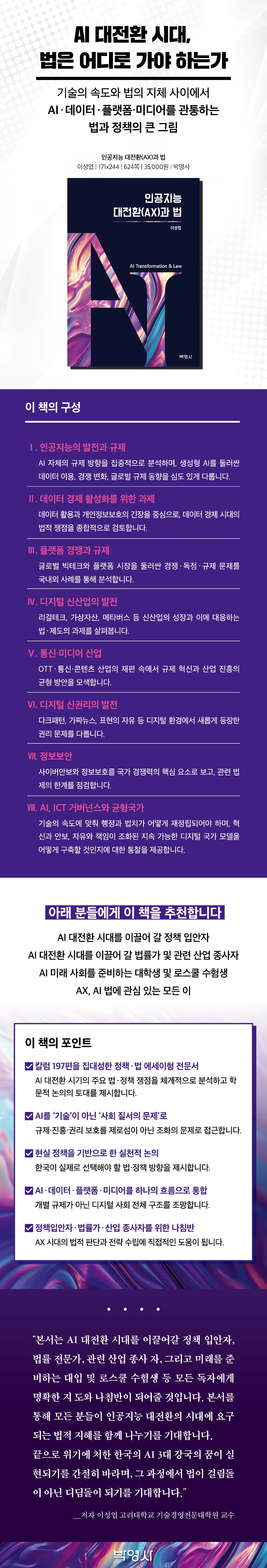 Ã¥¼ÓÀ¸·Î¼¹® ¿ì¸®´Â Áö±Ý ÀΰøÁö´É(AI)ÀÌ ÁÖµµÇÏ´Â Àηù ¹®¸íÀÇ ±Ùº»ÀûÀÎ º¯°îÁ¡, Áï ¡®AI ´ëÀüȯ(AX, Artificial Intelligence transformation)¡¯ÀÇ ½Ã´ë¸¦ »ì¾Æ°¡°í ÀÖ½À´Ï´Ù. AI ±â¼úÀº Çõ½ÅÀÇ ¼Óµµ¸¦ °¡¼ÓÈÇÏ¸ç »ê¾÷°ú »çȸÀÇ °æ°è¸¦ Çã¹°°í ÀÖÁö¸¸, ±âÁ¸ ¹ýÁú¼´Â ±â¼úÀÇ Áøº¸¸¦ µû¶óÀâÁö ¸øÇÏ´Â ¡®¹ýÀÇ Áöü(Lag of Law)¡¯ Çö»ó¿¡ Á÷¸éÇØ ÀÖ½À´Ï´Ù. AI ±â¼úÀº ÀÌÁ¦ ´õ ÀÌ»ó ÇϳªÀÇ »ê¾÷Àû µµ±¸³ª µðÁöÅÐ ÆíÀǼºÀÇ ¹®Á¦°¡ ¾Æ´Õ´Ï´Ù. ±×°ÍÀº »çȸ°¡ ½º½º·Î¸¦ ÀÌÇØÇÏ´Â ¹æ½Ä, Àΰ£ÀÌ ÀڽŰú ±â°è¿ÍÀÇ °ü°è¸¦ ÇØ¼®ÇÏ´Â ¹æ½Ä, ±¹°¡°¡ ¹Ì·¡¸¦ ¼³°èÇÏ´Â ¹æ½Ä ÀÚü¸¦ À籸¼ºÇÏ´Â ÈûÀÌ µÇ°í ÀÖ½À´Ï´Ù. AX´Â ±â¼úÇõ½ÅÀÇ »ç°ÇÀÌ ¾Æ´Ï¶ó, ¿ì¸®°¡ ¾î¶² »çȸ¸¦ ¸¸µé °ÍÀÎÁö¿¡ ´ëÇÑ Ã¶ÇÐÀû ¼±ÅÃÀÌÀÚ ¹ýÀû ¼±ÅÃÀÎ °ÍÀÔ´Ï´Ù. ÇÊÀÚ´Â ¿À·§µ¿¾È AI ¡¤ µ¥ÀÌÅÍ ¡¤ Åë½Å ¡¤ Ç÷§Æû Á¤Ã¥°ú ±ÔÁ¦ÀÇ ÇöÀå¿¡ Âü°¡Çϸé¼, ±â¼úÀÇ ¼Óµµ¿Í ¹ýÀÇ ¼Óµµ°¡ Ãæµ¹ÇÒ ¶§ ¹ß»ýÇÏ´Â ±äÀå°ú °¡´É¼ºÀ» ´©±¸º¸´Ù °¡±îÀÌ¿¡¼ °æÇèÇØ ¿Ô½À´Ï´Ù. ÇÏÁö¸¸ ±× °úÁ¤¿¡¼ ´õ¿í Àý½ÇÇÏ°Ô ´À³¤ ¹Ù´Â, ¹®Á¦´Â ±â¼úÀ̳ª ¹ý ÀÚü°¡ ¾Æ´Ï¶ó ±â¼úÀ» ÀÌÇØÇÏ°í ´Ù·ç´Â ¿ì¸®ÀÇ Åµµ¿Í »çÀ¯ ¹æ½ÄÀÌ Áß¿äÇÏ´Ù´Â °ÍÀÔ´Ï´Ù. ¿ì¸®°¡ AI¸¦ ¾î¶»°Ô ¹Þ¾ÆµéÀÌ°í ±ÔÁ¤ÇÏ´À³Ä, ¾î¶»°Ô Ȱ¿ëÇÒ °ÍÀΰ¡¿¡ µû¶ó ±ÔÁ¦´Â ¾ï¾ÐÀÌ µÉ ¼öµµ, ÃËÁøÀÌ µÉ ¼öµµ ÀÖ½À´Ï´Ù. ¿ì¸®°¡ µ¥ÀÌÅÍÀÇ º»ÁúÀ» ¾î¶»°Ô ÆÄ¾ÇÇÏ´À³Ä¿¡ µû¶ó °³ÀÎÀÇ ±Ç¸®¿Í »ê¾÷ÀÇ Çõ½ÅÀº »óÃæÇÒ ¼öµµ, Á¶ÈµÉ ¼öµµ ÀÖ´Â °ÍÀÔ´Ï´Ù. Ç÷§Æû, ¹Ìµð¾î, Åë½Å, °Å¹ö³Í½ºÀÇ ³íÀï ¶ÇÇÑ °á±¹ ±â¼ú°ú ¹ýÀ» ÅëÇØ »çȸ¸¦ ¾î¶»°Ô Á¶Á÷ÇÒ °ÍÀΰ¡¶ó´Â Áú¹®ÀÔ´Ï´Ù. ±¸Ã¼ÀûÀ¸·Î º»¼´Â ´ÙÀ½°ú °°Àº ¼¼ °¡Áö ¹®Á¦ÀǽÄÀ» ´ã°í ÀÖ½À´Ï´Ù. ù°, ¹ýÀº ±â¼úÀ» µû¶ó°¡´Â °ÍÀÌ ¾Æ´Ï¶ó, ±â¼úÀÌ ¸¸µé¾î³¾ »çȸÀÇ ¸ð½À¿¡ ¼±Á¦ÀûÀ¸·Î ÀÀ´äÇØ¾ß ÇÕ´Ï´Ù. À§Çè ÅëÁ¦°¡ ¹ýÀÇ º»ÁúÀ̶ó°í ÀÌÇØµÇÁö¸¸ ³ª¾Æ°¡ Çõ½ÅÀ» ÅëÇÑ »çȸ º¯È¸¦ ¼±µµÇÏ´Â ÀÎÇÁ¶ó°¡ µÉ ¼ö ÀÖ¾î¾ß ÇÑ´Ù´Â °ÍÀÔ´Ï´Ù. µÑ°, Çõ½ÅÀ» °Á¶ÇÏ¸é ±Ç¸® Ä§ÇØ°¡ ¹®Á¦ µÇ°í, ±Ç¸®¸¦ °Á¶ÇÏ¸é »ê¾÷ÀÌ Á¤Ã¼µÇ°í, ±¹°¡ °³ÀÔÀ» °Á¶Çϸé ÀÚÀ¯¿Í âÀǼºÀÌ ÈÑ¼ÕµÉ ¼ö ÀÖ½À´Ï´Ù. ÀÌ·¯ÇÑ °¥µîÀ» Á¦·Î¼¶ÀÇ ÇÔÁ¤ÀÌ ¾Æ´Ï¶ó »õ·Î¿î Á¶È¸¦ ¼³°èÇÒ ±âȸ¶ó°í ºÁ¾ß ÇÕ´Ï´Ù. ¹ýÀº ¾î´À ÇÑÂÊÀÇ ½Â¸®¸¦ ¸ñÇ¥·Î ÇÏ´Â °ÍÀÌ ¾Æ´Ï¶ó, ¼·Î ´Ù¸¥ °¡Ä¡µéÀÌ Ãæµ¹ÇÏÁö ¾Ê°í °øÁøÈ(co-evolution)Çϵµ·Ï ¸¸µå´Â ¼³°èÀÇ ±â¼úÀÌ µÇ¾î¾ß ÇÕ´Ï´Ù. ¼Â°, º»¼´Â ½ÇÇö °¡´É¼º ¾ø´Â ¿ø·ÐÀÌ ¾Æ´Ñ Áö±Ý Çѱ¹ÀÌ ½ÇÁ¦·Î ¼±ÅÃÇØ¾ß ÇÒ ¹æÇâÀº ¹«¾ùÀΰ¡¶ó´Â Áú¹®¿¡ ´ëÇÑ ´äÀ» Á¦½ÃÇϰíÀÚ ³ë·ÂÇß½À´Ï´Ù. º»¼´Â ÇÊÀÚ°¡ 2021³âºÎÅÍ 2025³â±îÁö ÁÖ¿ä Àϰ£Áö, Àü¹®Áö µîÀÇ ±â°í ÃÑ 197ÆíÀ» Åä´ë·Î AX ½Ã´ëÀÇ ¹ýÀû ÀïÁ¡À» ÃÑ 8°³ÀÇ °Å´ë ÁÖÁ¦·Î ³ª´©¾î ÀÔüÀûÀ¸·Î ´Ù·ì´Ï´Ù. Á¦1ÀåÀº AI ÀÚüÀÇ ±ÔÁ¦ ¹æÇâÀ» ÁýÁßÀûÀ¸·Î ºÐ¼®Çϸç, »ý¼ºÇü AI¸¦ µÑ·¯½Ñ µ¥ÀÌÅÍ ÀÌ¿ë, °æÀï º¯È, ±Û·Î¹ú ±ÔÁ¦ µ¿ÇâÀ» ½Éµµ ÀÖ°Ô ´Ù·ì´Ï´Ù. Á¦2Àå°ú Á¦3ÀåÀº µðÁöÅÐ °æÁ¦ÀÇ ±Ù°£ÀÎ µ¥ÀÌÅÍ, °³ÀÎÁ¤º¸ Ȱ¿ë°ú º¸È£, ±×¸®°í ±Û·Î¹ú ºòÅ×Å©ÀÇ µ¶Á¡Àû ÁöÀ§¸¦ ´Ù·ç´Â Ç÷§Æû °æÀï°ú ±ÔÁ¦ À̽´¸¦ ´Ù·ì´Ï´Ù. Á¦4Àå°ú Á¦5Àå¿¡¼´Â ¸®°ÉÅ×Å©, °¡»óÀÚ»ê, ¸ÞŸ¹ö½º µî µðÁöÅÐ ½Å»ê¾÷ÀÇ ¹ßÀü°ú OTT, 6G Åë½Å µîÀ¸·Î ÀçÆíµÇ´Â Åë½Å¹Ìµð¾î»ê¾÷ÀÇ ¹ýÀû °úÁ¦¸¦ Á¦½ÃÇÕ´Ï´Ù. Á¦6Àå°ú Á¦7ÀåÀº ´ÙÅ©ÆÐÅÏ, °¡Â¥´º½º µîÀ¸·ÎºÎÅÍ µðÁöÅÐ ÀÌ¿ëÀÚÀÇ ±Ç¸®¸¦ ¾î¶»°Ô º¸È£ÇÒ °ÍÀÎÁö¿Í »çÀ̹ö ¡¤ Á¤º¸º¸¾ÈÀÇ ¹ýÁ¦Àû °úÁ¦¸¦ ³íÇÕ´Ï´Ù. ¸¶Áö¸· Á¦8Àå¿¡¼´Â ±â¼úÀÇ ¼Óµµ¿¡ ¸ÂÃç ÇàÁ¤°ú ¹ýÄ¡°¡ ¾î¶»°Ô ÀçÁ¤¸³µÇ¾î¾ß Çϸç, Çõ½Å°ú ¾Èº¸, ÀÚÀ¯¿Í Ã¥ÀÓÀÌ Á¶ÈµÈ Áö¼Ó °¡´ÉÇÑ µðÁöÅÐ ±¹°¡ ¸ðµ¨À» ¾î¶»°Ô ±¸ÃàÇÒ °ÍÀÎÁö¿¡ ´ëÇÑ ÅëÂûÀ» Á¦°øÇÕ´Ï´Ù. º»¼ÀÇ Ãâ°£À» ±â²¨ÀÌ Áö¿øÇØ ÁֽŠ¹Ú¿µ»ç ¾ÈÁ¾¸¸ ȸÀå´Ô, ¾È»óÁØ ´ëÇ¥´Ô, ±èÇÑÀ¯ °úÀå´Ô°ú ÆíÁýÀ» À§ÇØ ¾Æ³¦¾ø´Â ³ë·ÂÀ» ±â¿ï¿© ÁֽŠÃÖÀ¯¶ó ´Ô²² ÀÌ ÀÚ¸®¸¦ ºô·Á ±íÀÌ °¨»çµå¸³´Ï´Ù. ¶ÇÇÑ Ä®·³ ÁýÇÊ ±âȸ¸¦ ÁֽŠ¿©·¯ ¾ð·Ð»ç °ü°èÀڵ鲲µµ °¨»çÀÇ ¸»¾¸À» µå¸³´Ï´Ù. °³ÀÎÀûÀ¸·Î ¡ºµðÁöÅÐ Æ®·£½ºÆ÷¸ÞÀ̼ǰú ¹ý¡», ¡ºAI ±ÔÁ¦¹ý¡» ÀÌÈÄ ¼¼ ¹øÂ° ´Üµ¶Àú¼¸¦ Ãâ°£ÇÏ°Ô µÈ Á¡À» ±â»Ú°Ô »ý°¢Çϸç, ¹ýÁ¶ÀÎÀÇ ²ÞÀ» ÆîÄ¡±â À§ÇØ ³ë·