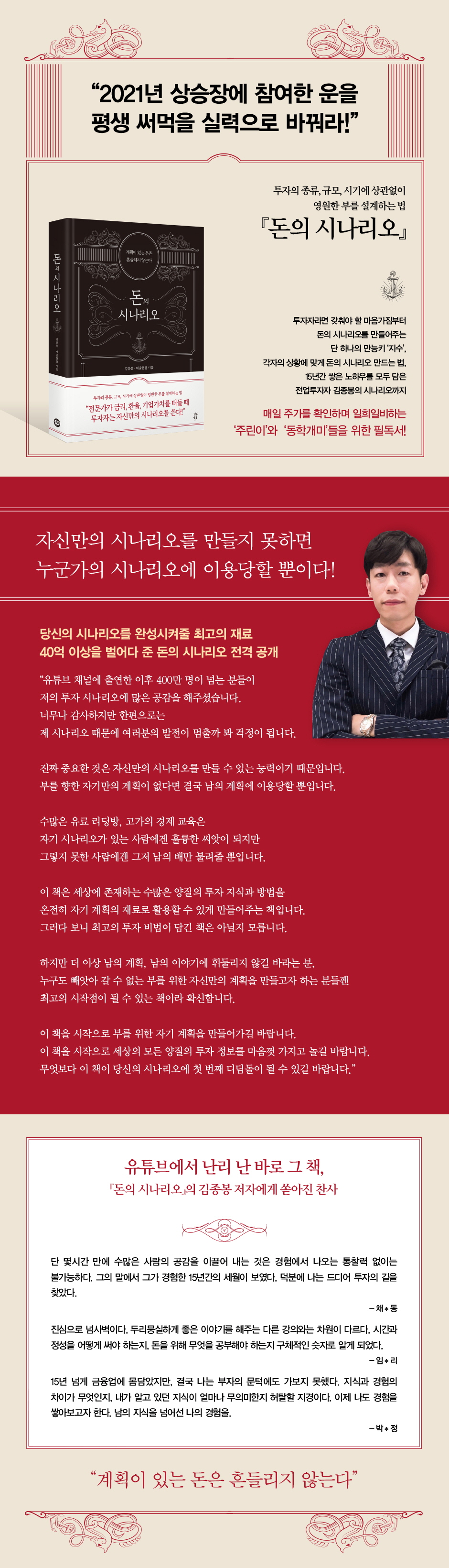 À̸¦ À§ÇØ ÀÌ Ã¥Àº ÅõÀÚÀڷμ °®Ãç¾ß ÇÒ ¸¶À½°¡Áü, µ·ÀÇ ½Ã³ª¸®¿À¸¦ ¾²±â À§ÇØ ¹Ýµå½Ã °øºÎÇØ¾ß ÇÒ Çʼö Áö½Ä, ±×¸®°í ÀڽŸ¸ÀÇ µ·ÀÇ ½Ã³ª¸®¿À¸¦ ¾²´Â ¹ýÀ» ¼Ò°³ÇÑ´Ù. ¶ÇÇÑ, Á¾Àãµ· 2000¸¸ ¿øÀ¸·Î 40¾ï ¿øÀ» ¸¸µç ÀúÀÚ°¡ 15³â µ¿¾È Á÷Á¢ °æÇèÇÑ °ÍÀ» Åä´ë·Î ¿Ï¼ºÇÑ µ·ÀÇ ½Ã³ª¸®¿À¸¦ ÅëÇØ ÀڽŸ¸ÀÇ ÅõÀÚ ³ëÇÏ¿ì±îÁö Àü°Ý °ø°³ÇÑ´Ù. ÀÌ Ã¥À» ÅëÇØ µ¶ÀÚ´Â °¢ÀÚÀÇ È¯°æ, ¼ºÇâ, ³ªÀÌ, µ·ÀÇ Å©±â¿¡ ¸Â°Ô ÀڽŸ¸ÀÇ µ·ÀÇ ½Ã³ª¸®¿À¸¦ ÀÛ¼ºÇÒ ¼ö ÀÖÀ» °ÍÀ̸ç, À̸¦ ÅëÇØ ¿µ¿øÇÑ µ·¿¡ ÇÑ °ÉÀ½ ´õ ´Ù°¡°¥ ¼ö ÀÖÀ» °ÍÀÌ´Ù.