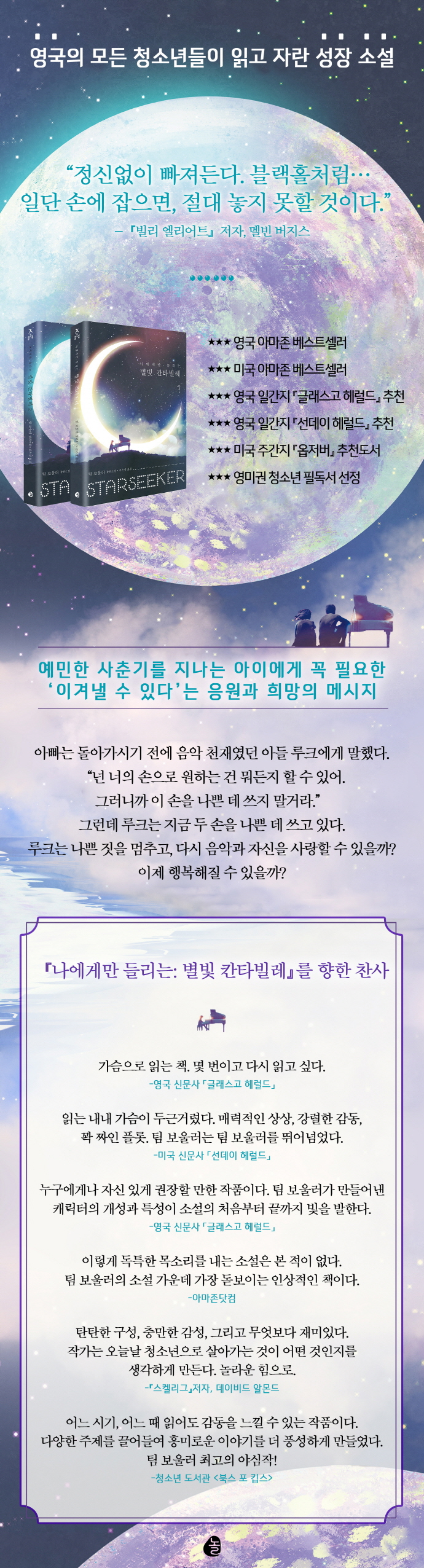 Á¤½Å¾øÀÌ ºüÁ®µç´Ù, ºí·¢È¦Ã³·³. ¡¶³ª¿¡°Ô¸¸ µé¸®´Â: º°ºû ÄŸºô·¹¡·´Â ±äÀå°¨ÀÌ °¨µµ´Â ¼Ò¼³ÀÌ´Ù. ÇÏÁö¸¸ ¹«°ÌÁö´Â ¾Ê´Ù. ÆÀ º¸¿ï·¯´Â ÀÌ Ã¥¿¡¼ ¡®Àΰ£ÀÇ ¿µÈ¥¡¯À̶ó´Â ¼ÒÀ縦 ´Ù·ç¾ú°í ´Ù¾çÇÑ »ç°Ç°ú ¿Á¤, À½¾Ç, ±×¸®°í ¹Ì½ºÅ͸®¸¦ °çµé¿© ³»³õ¾Ò´Ù. ¹Ý¦¹Ý¦ ºû³ª´Â º°Ã³·³ ÀÛ°í ºÎµå·¯¿î ¼ÕÀ¸·Î ¸¶À½À» ÅåÅå ´Ùµ¶¿©ÁÖ´Â °Í °°´Ù. ÀÏ´Ü ¼Õ¿¡ ÀâÀ¸¸é Àý´ë ³õÁö ¸øÇÒ Ã¥ÀÌ´Ù. -¡ººô¸® ¿¤¸®¾îÆ®¡»ÀúÀÚ, ¿¤ºó ¸ÓÁö½º