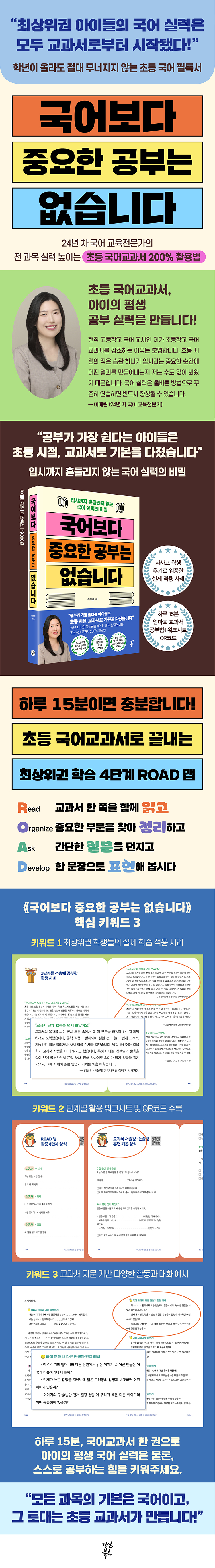 ÀÌÁ¦ ±³°ú¼¸¦ »õ·Ó°Ô ¹Ù¶óº¼ ¶§ÀÔ´Ï´Ù.¡º±¹¾îº¸´Ù Áß¿äÇÑ °øºÎ´Â ¾ø½À´Ï´Ù¡»´Â ±¹¾î °øºÎ¸¦ 4´Ü°è ROAD ¸Ê(Read, Á¦´ë·Î Àб⠡æ Organize, ±¸Á¶ÈÇϱ⠡æ Ask, Áú¹®Çϱ⠡æ Develop, Ç¥ÇöÇϱâ) À¸·Î ¾È³»ÇÕ´Ï´Ù. Çг⺰ ±³°ú¼ Áö¹®À» Áß½ÉÀ¸·Î ÇÑ Àб⠴ëÈ ¿¹½Ã, ¾ÆÀÌÀÇ Áú¹®À» À̲ø¾î³»´Â ¹ý, »ç°í·ÂÀ» ³ôÀÌ´Â ±¹¾î ¼ºÀå Æ÷Æ®Æú¸®¿À ÀÛ¼º¹ý, ¸ÞŸÀÎÁö¸¦ Ű¿ì´Â Áú¹®Áö µî ´Ù¾çÇÑ ¿öÅ©½ÃÆ® ¾ç½ÄÀ» QR ÄÚµå·Î ¼ö·ÏÇØ ¹Ýº¹Çؼ Ȱ¿ëÇÒ ¼ö ÀÖµµ·Ï ±¸¼ºÇß½À´Ï´Ù.±¹¾î±³°ú¼¸¦ Á¦´ë·Î Ȱ¿ëÇÑ´Ù¸é Æ¯º°ÇÑ »ç±³À°À̳ª ¹®Á¦Áý ¾øÀ̵µ ±ÕÇü ÀâÈù ±¹¾î ÇнÀÀº ¹°·Ð, ½º½º·Î ÇнÀÀ» Á¶À²ÇÏ´Â ÀÚ±âÁÖµµ ÇнÀ ¿ª·®±îÁö Ű¿ï ¼ö ÀÖ½À´Ï´Ù. ±¹¾î ½Ç·ÂÀº ¿Ã¹Ù¸¥ ¹æ¹ýÀ¸·Î ²ÙÁØÈ÷ ¿¬½ÀÇÏ¸é ¹Ýµå½Ã Çâ»óµË´Ï´Ù. ÀÌ Ã¥Àº ¿ì¸® ¾ÆÀÌÀÇ Æò»ý Çо÷Àº ¹°·Ð, »îÀÇ ±â¹ÝÀÌ µÇ´Â ±¹¾î °øºÎÀÇ ±æÀ» ¿¾îÁÖ´Â ¾È³»¼°¡ µÇ¾îÁÙ °ÍÀÔ´Ï´Ù.