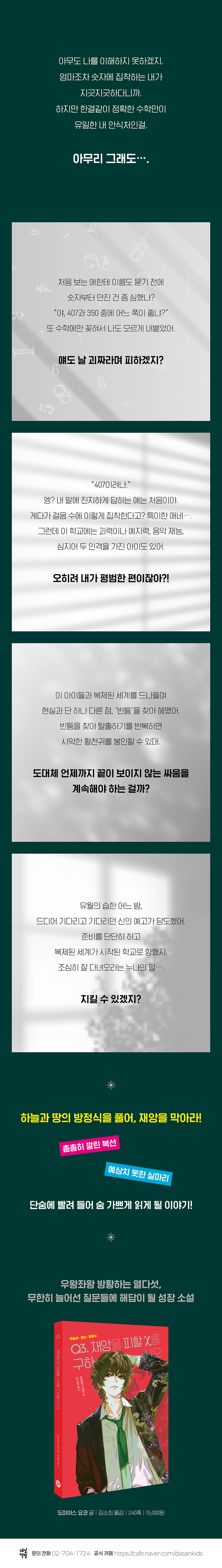Ã¥¼Ò°³30³â ³Ñ°Ô ´Ù¾çÇÑ Ã¥À» ½á ¿Â º£½ºÆ®¼¿·¯ ÀÛ°¡, µµ¹Ì¾ß½º ¿äÄÚÀÇ Ã»¼Ò³â ¼Ò¼³ÀÌ Ãâ°£µÇ¾ú´Ù. ¡´Çϴðú ¶¥ÀÇ ¹æÁ¤½Ä¡µ ½Ã¸®Áî´Â Ưº°ÇÑ Àç´ÉÀ» °¡Áø ¾ÆÀ̵éÀÌ º¹Á¦µÈ ¼¼°èÀÇ ºóÆ´À» ã¾Æ Àç¾Ó¿¡¼ ¼¼»óÀ» ±¸ÇÏ´Â À̾߱â´Ù. ¸¶Áö¸· ±Ç ¡¶Q3. Àç¾ÓÀ» ÇÇÇÒ X¸¦ ±¸ÇϽÿÀ¡·¿¡¼´Â ¸¶Ä§³» ¸ðµç ÆÛÁñÀÌ Çϳª·Î ¸ÂÃçÁö¸ç »ó»óÀ» ¶Ù¾î³Ñ´Â ³î¶ó¿î À̾߱Ⱑ ¿Ï¼ºµÈ´Ù.