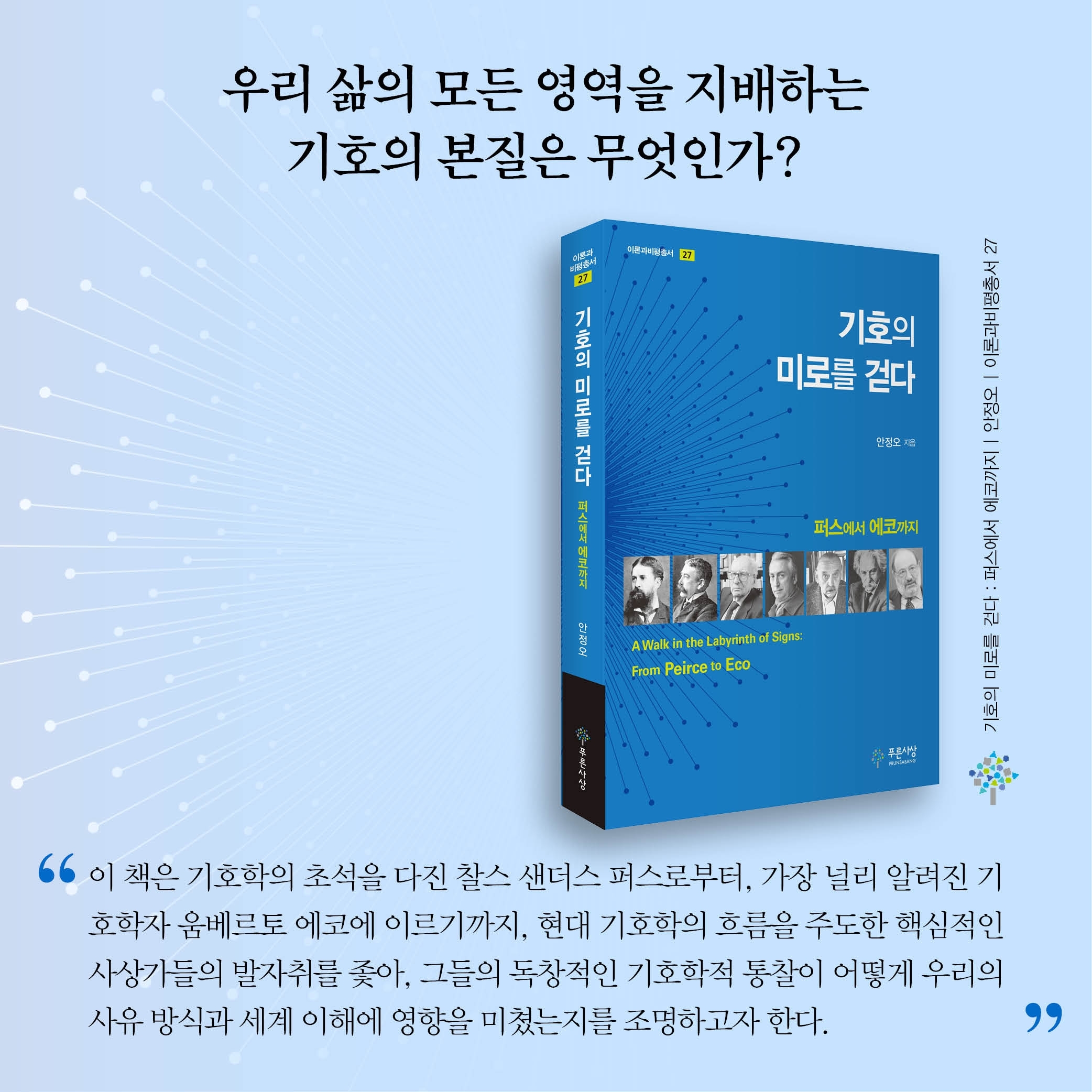 ¿ì¸®´Â ±âÈ£ ¼Ó¿¡¼ »ì¾Æ°¡°í, ±âÈ£·Î »çÀ¯Çϸç, ±âÈ£¸¦ ÅëÇØ ¼ÒÅëÇÑ´Ù. ÀÌ Ã¥Àº ¿ì¸®°¡ ÀÎÁöÇÏÁö ¸øÇÏ´Â ¼ø°£¿¡µµ »îÀÇ ¸ðµç ¿µ¿ªÀ» Áö¹èÇÏ´Â ±âÈ£(sign)ÀÇ º»ÁúÀ» ޱ¸Çϰí, ±× ±âÈ£¸¦ ¿¬±¸ÇÏ´Â Çй®ÀÎ ±âÈ£ÇÐ(semiotics)ÀÇ ¹ßÀÚÃ븦 µû¶ó°¡´Â ¿©Á¤ÀÌ´Ù. ƯÈ÷, Çö´ë ±âÈ£ÇÐÀÇ È帧À» ÁÖµµÇÑ ÇÙ½ÉÀûÀÎ »ç»ó°¡µéÀÇ ¹ßÀÚÃ븦 ÁÀ¾Æ, ±×µéÀÇ µ¶Ã¢ÀûÀÎ ±âÈ£ÇÐÀû ÅëÂûÀÌ ¾î¶»°Ô ¿ì¸®ÀÇ »çÀ¯ ¹æ½Ä°ú ¼¼°è ÀÌÇØ¿¡ ¿µÇâÀ» ¹ÌÃÆ´ÂÁö¸¦ Á¶¸íÇϰíÀÚ ÇÑ´Ù. ±âÈ£ÇÐÀº ¾ð¾îÇÐ, öÇÐ, ¹®ÇÐ, ¿¹¼ú, »çȸÇÐ µî ´Ù¾çÇÑ Çй® ºÐ¾ß¿¡ °ÉÃÄ Æø³Ð°Ô Àû¿ëµÇ¸ç, Àΰ£ÀÇ ÀÇ¹Ì »ý¼º °úÁ¤À» ÀÌÇØÇÏ´Â µ¥ ÇʼöÀûÀÎ µµ±¸·Î ÀÚ¸®¸Å±èÇß´Ù. ´Ü¼øÈ÷ ¾ð¾îÀû ±âÈ£¸¸À» ´Ù·ç´Â °ÍÀ» ³Ñ¾î, À̹ÌÁö, ¸öÁþ, ¿ÊÂ÷¸², ½ÉÁö¾î ħ¹¬¿¡ À̸£±â±îÁö Àǹ̸¦ Àü´ÞÇÏ´Â ¸ðµç Çö»óÀ» ±âÈ£ÀÇ °üÁ¡¿¡¼ ºÐ¼®ÇÑ´Ù. ÀÌ´Â °ð ±âÈ£ÇÐÀÌ ¿ì¸®ÀÇ ÀÏ»ó°ú ¹®È¸¦ ÇØµ¶ÇÏ´Â °·ÂÇÑ ¿¼è°¡ µÊÀ» ÀǹÌÇÑ´Ù. ÀÌ Ã¥Àº ¸ÕÀú ±âÈ£¿Í ±âÈ£ÇÐÀÇ °³³äÀ» ¸íÈ®È÷ Á¤ÀÇÇϰí, ±× ¿ª»ç¸¦ °£·«È÷ »ìÇÇ´Â °ÍÀ¸·Î ½ÃÀÛÇÑ´Ù. °í´ë ±×¸®½ºÀÇ Ã¶ÇÐÀÚµé·ÎºÎÅÍ ½ÃÀÛµÈ ±âÈ£¿¡ ´ëÇÑ Å½±¸°¡ ¾î¶»°Ô ±ÙÇö´ë¿¡ À̸£·¯ µ¶¸³ÀûÀÎ Çй® ºÐ¾ß·Î ¹ßÀüÇß´ÂÁö¸¦ »ìÆìº¼ °ÍÀÌ´Ù. ±×¸®°í º»°ÝÀûÀ¸·Î Çö´ë ±âÈ£ÇÐÀÇ ÁÖ¿ä È帧À» Çü¼ºÇÑ Àϰö ¸íÀÇ »ç»ó°¡µéÀ» ½ÉÃþÀûÀ¸·Î ´Ù·é´Ù. Âû½º »÷´õ½º ÆÛ½º(Charles Sanders Peirce, 1839~1914)´Â ³í¸®ÇÐÀÚÀÌÀÚ Ã¶ÇÐÀڷμ ±âÈ£ÇÐÀÇ Ãʼ®À» ´ÙÁø Àι°ÀÌ´Ù. ±×ÀÇ »ï¿øÀûÀÎ ±âÈ£ °³³ä°ú ¹üÁÖ·ÐÀº ¿À´Ã³¯ ±âÈ£ÇÐ ¿¬±¸ÀÇ Áß¿äÇÑ Ãâ¹ßÁ¡ÀÌ µÈ´Ù. Æä¸£µð³¶ µå ¼Ò½¬¸£(Ferdinand de Saussure, 1857~1913)´Â Çö´ë ¾ð¾îÇÐÀÇ ¾Æ¹öÁöÀÌÀÚ ±¸Á¶ÁÖÀÇ ±âÈ£ÇÐÀÇ ¼±±¸ÀÚ·Î Æò°¡¹Þ´Â´Ù. ±×ÀÇ ¾ð¾î±âÈ£ ÀÌ·Ð, ƯÈ÷ ±âÇ¥¿Í ±âÀÇÀÇ À̺йýÀû °ü°è´Â ÀÌÈÄ ¸¹Àº ÇÐÀڵ鿡°Ô Áö´ëÇÑ ¿µÇâÀ» ¹ÌÃÆ´Ù. Ŭ·Îµå ·¹ºñ½ºÆ®·Î½º(Claude L?vi-Strauss, 1908~2009)´Â ±¸Á¶ÁÖÀÇ¿Í ±âÈ£ÇÐ »çÀ̸¦ ¿¬°áÇØÁØ ÇÐÀڷμ ±âÈ£ÇÐÀÚµé°ú ¸¹Àº °ø°¨´ë¸¦ Çü¼ºÇß´Ù. ·Ñ¶û ¹Ù¸£Æ®(Roland Barthes, 1915~1980)´Â ¼Ò½¬¸£ÀÇ ±âÈ£ÇÐÀ» È®ÀåÇÏ¿© ½ÅÈ, ÆÐ¼Ç, ±¤°í µî ´ëÁß¹®È Çö»óÀ» ºÐ¼®ÇÏ´Â µ¥ Àû¿ëÇß´Ù. ±×ÀÇ ±âÈ£ÇÐÀº ºñÆÇÀû »ç°í¸¦ ÅëÇØ ¿ì¸® ÁÖº¯ÀÇ Àͼ÷ÇÑ °ÍµéÀ» ³¸¼³°Ô º¸°í »õ·Î¿î Àǹ̸¦ ¹ß°ßÇÏ´Â ¹æ¹ýÀ» Á¦½ÃÇÑ´Ù. ¾Ë±â¸£´Ù½º ÁÙ¸®¾Ó ±×·¹¸¶½º(Algirdas Julien Greimas, 1917~1992)´Â ¼»ç±âÈ£ÇÐÀÇ ´ë°¡·Î, ¼»ç±¸Á¶¸¦ ½ÉÃþÀûÀ¸·Î ºÐ¼®ÇÏ¿© ÀǹÌÀÇ »ý¼º °úÁ¤À» ¹àÇô³Â´Ù. ±×ÀÇ Àǹ̷ÐÀû »ç°¢ÇüÀº º¹ÀâÇÑ ¼»ç±¸Á¶¸¦ ÇØÃ¼Çϰí ÀÌÇØÇÏ´Â µ¥ À¯¿ëÇÑ ºÐ¼® ƲÀ» Á¦°øÇÑ´Ù. À¯¸® ·ÎÆ®¸¸(Yuri Lotman, 1922~1993)Àº ¹®È±âÈ£ÇÐÀÇ ¼±±¸Àڷμ, ¹®È ÅØ½ºÆ®¸¦ ±âÈ£ÇÐÀûÀ¸·Î ºÐ¼®ÇÏ°í ¹®È Àüü¸¦ °Å´ëÇÑ ¡®±âÈ£°è(semiosphere)¡¯·Î ÆÄ¾ÇÇÏ´Â µ¶Ã¢ÀûÀÎ ½Ã°¢À» Á¦½ÃÇß´Ù. ±×¸®°í ¸¶Áö¸·À¸·Î, ¿òº£¸£Åä ¿¡ÄÚ(Umberto Eco, 1932~2016)´Â ´ëÁß¿¡°Ô °¡Àå Àß ¾Ë·ÁÁø ±âÈ£ÇÐÀÚÀÌÀÚ ¼Ò¼³°¡ÀÌ´Ù. ±×´Â ÆÛ½ºÀÇ ±âÈ£ ÀÌ·ÐÀ» ¹ßÀü½ÃÄÑ ±âÈ£ÇÐÀÇ ¿µ¿ªÀ» È®ÀåÇϰí, ¡ºÀÏ¹Ý ±âÈ£ À̷С»À» ÅëÇØ ±âÈ£ÇÐÀÇ Ã¼°è¸¦ ±¸ÃàÇß´Ù. ±×ÀÇ ÀúÀÛµéÀº ±âÈ£ÇÐÀÌ ´Ü¼øÇÑ Çй®ÀÌ ¾Æ´Ï¶ó, ¿ì¸®°¡ ¼¼»óÀ» ÀÌÇØÇϰí ÇØ¼®ÇÏ´Â ¹æ½Ä ÀÚü¸¦ º¯È½ÃŰ´Â °·ÂÇÑ µµ±¸ÀÓÀ» º¸¿©ÁØ´Ù. ƯÈ÷ ±×ÀÇ ¼Ò¼³ ¡ºÀå¹ÌÀÇ À̸§¡»Àº ±âÈ£ÇÐÀû ÅëÂûÀ» ¼»çÀÇ ÇüÅ·ΠǮ¾î³» ´ëÁßÀÇ ±âÈ£Çп¡ ´ëÇÑ °ü½ÉÀ» Æø¹ßÀûÀ¸·Î À̲ø¾î³Â´Ù. ÀÌµé °ÅÀåÀÇ »çÀ¯´Â Æ÷½ºÆ®¸ð´õ´ÏÁò(postmodernism)ÀÇ ½Ã´ë¿¡ ±âÈ£°¡ ¾î¶»°Ô Àνĵǰí Ȱ¿ëµÇ´ÂÁö¿¡ ´ëÇÑ Áß¿äÇÑ ´Ü¼¸¦ Á¦°øÇÑ´Ù. ±âÈ£¿Í ½ÇÀçÀÇ °ü°è°¡ ´õ¿í º¹ÀâÇØÁö°í À¯µ¿ÀûÀ¸·Î º¯¸ðÇÏ´Â ½Ã´ë¿¡, ±âÈ£ÇÐÀº ¿©ÀüÈ÷ ¿ì¸®ÀÇ »çÀ¯¸¦ ¾È³»ÇÏ°í ¼¼°è¸¦ ÀÌÇØÇÏ´Â µ¥ ÇÙ½ÉÀûÀÎ ¿ªÇÒÀ» ¼öÇàÇÑ´Ù. ÀÌ Ã¥Àº ´Ü¼øÈ÷ ÀÌ·ÐÀ» ³ª¿ÇÏ´Â µ¥ ±×Ä¡Áö ¾Ê°í, °¢ »ç»ó°¡ÀÇ ±âÈ£ÇÐÀû °³³äÀÌ ¿À´Ã³¯ ¿ì¸®ÀÇ »çÀ¯¿Í »î¿¡ ¾î¶² ÅëÂûÀ» Á¦°øÇÏ´ÂÁö¸¦ ÇÔ²² °í¹ÎÇϰíÀÚ ÇÑ´Ù. ±âÈ£°¡ ¾î¶»°Ô Àǹ̸¦ ¸¸µé¾î³»°í, ¿ì¸®´Â ±× ±âÈ£¸¦ ¾î¶»°Ô ÇØ¼®Çϸç, ³ª¾Æ°¡ ±âÈ£°¡ ¾î¶»°Ô ¿ì¸®ÀÇ Çö½ÇÀ» ±¸¼ºÇÏ´ÂÁö¿¡ ´ëÇÑ Áú¹®µéÀ» ´øÁú °ÍÀÌ´Ù. µ¶ÀÚµéÀÌ ÀÌ Ã¥À» ÅëÇØ ±âÈ£ÇÐÀ̶ó´Â Èï¹Ì·Î¿î Çй®ÀÇ ¼¼°è·Î ±íÀÌ ºüÁ®µé°í, ÆÛ½º¿¡¼ ¿¡ÄÚ¿¡ À̸£´Â ÁöÀû ¿©Á¤À» ÇÔ²²Çϸç, ±âÈ£°¡ ¿ì¸®ÀÇ »çÀ¯¿Í ¾î¶»°Ô ±ä¹ÐÇÏ°Ô ¿«
