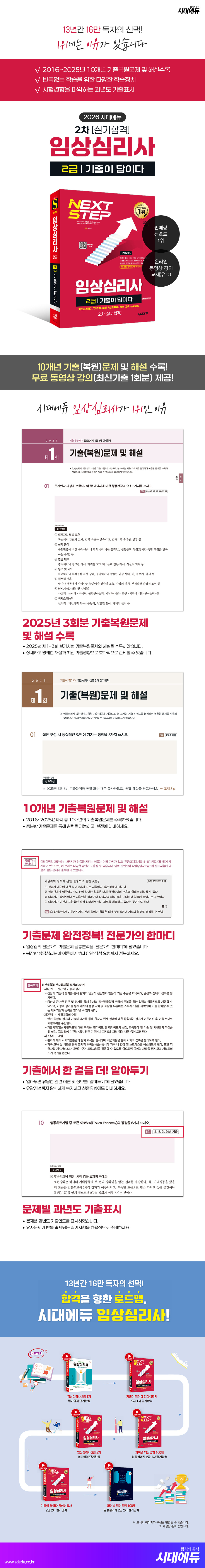 ÀÓ»ó½É¸®»ç ÀڰݽÃÇèÀ» ÁغñÇÏ´Â ¼öÇè»ýºÐµéÀ» À§ÇØ, º» ±³Àç¿¡´Â 2016³âºÎÅÍ 2025³â±îÁöÀÇ ÀÓ»ó½É¸®»ç 2±Þ ½Ç±â½ÃÇè ±âÃ⺹¿ø¹®Á¦¿Í »ó¼¼ÇÑ ÇØ¼³À» ¼ö·ÏÇÏ¿´½À´Ï´Ù. ±×¸®°í ÃâÁ¦À¯ÇüÀ» ÆÄ¾ÇÇÏ¸ç ´Ù½Ã Çѹø ÀÌ·ÐÀ» Á¤¸®ÇÒ ¼ö ÀÖµµ·Ï ¡®»¡¸®º¸´Â °£´ÜÇÑ Å°¿öµå(»¡°£Å°)¡¯¸¦ ÇÔ²² ´ã¾Ò½À´Ï´Ù. ¼öÇè»ý ¿©·¯ºÐÀÌ º» ±³À縦 ÅëÇØ ÀÓ»ó½É¸®»ç 2±Þ ½Ç±â½ÃÇèÀÇ ÃâÁ¦°æÇâÀ» ºÐ¼®ÇÏ°í ºÎÁ·ÇÑ ÇнÀÀ» º¸°ÇÏ¿© öÀúÈ÷ ´ëºñÇÏ½Ç ¼ö ÀÖµµ·Ï ±¸¼ºÇÏ¿´½À´Ï´Ù.