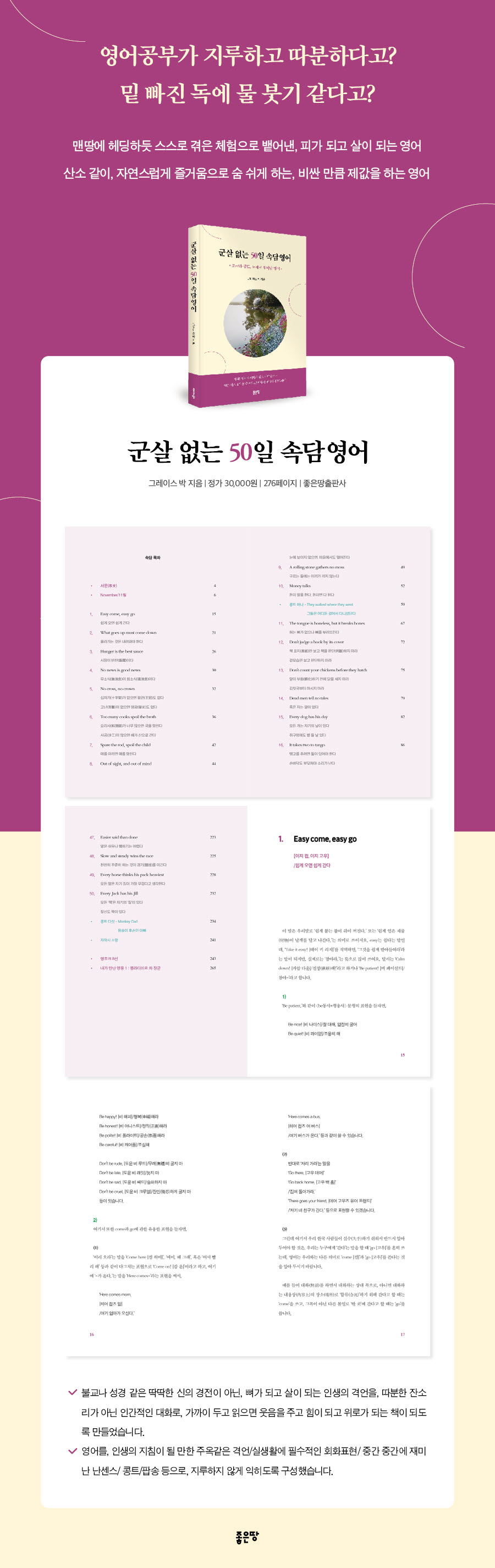 Ã¥ÀÇ ±¸¼ºÀº 50ÀÏ µ¿¾È ÇÏ·ç¿¡ Çϳª¾¿ ¿µ¾î ¼Ó´ãÀ» ÇнÀÇÏ´Â ¹æ½ÄÀ¸·Î, °¢ ¼Ó´ã¿¡ ´ëÇÑ ÇØ¼®°ú ¹è°æ ¼³¸í, °ü·Ã Ç¥Çöµé±îÁö ¾ËÂ÷°Ô ´ã°Ü ÀÖ´Ù. ¡°Easy come, easy go¡±³ª ¡°No pain, no gain¡±°ú °°Àº Ä£¼÷ÇÑ ¼Ó´ãºÎÅÍ ¡°Every Jack has his Jill¡±Ã³·³ Çѱ¹¾î¿Í´Â ´Ù¼Ò ´Ù¸¥ ¹®ÈÀû °¨¼ö¼ºÀ» Áö´Ñ ¹®Àå±îÁö ´Ù¾çÇÏ°Ô ´Ù·ç°í ÀÖ¾î ÇнÀÀÇ Àç¹Ì¿Í ±íÀ̸¦ µ¿½Ã¿¡ Àâ¾Ò´Ù. ¿©±â¿¡ ÀúÀÚÀÇ À¯¸Ó °¨°¢ÀÌ µ¸º¸ÀÌ´Â ÄáÆ®¿Í µ¶ÀÚ¿¡°Ô °Ç³×´Â ÀÀ¿øÀÇ ¸»µéÀº ÇнÀÀ» À̾·Á´Â µ¿±â¸¦ ´õ¿í ºÏµ¸¿î´Ù.