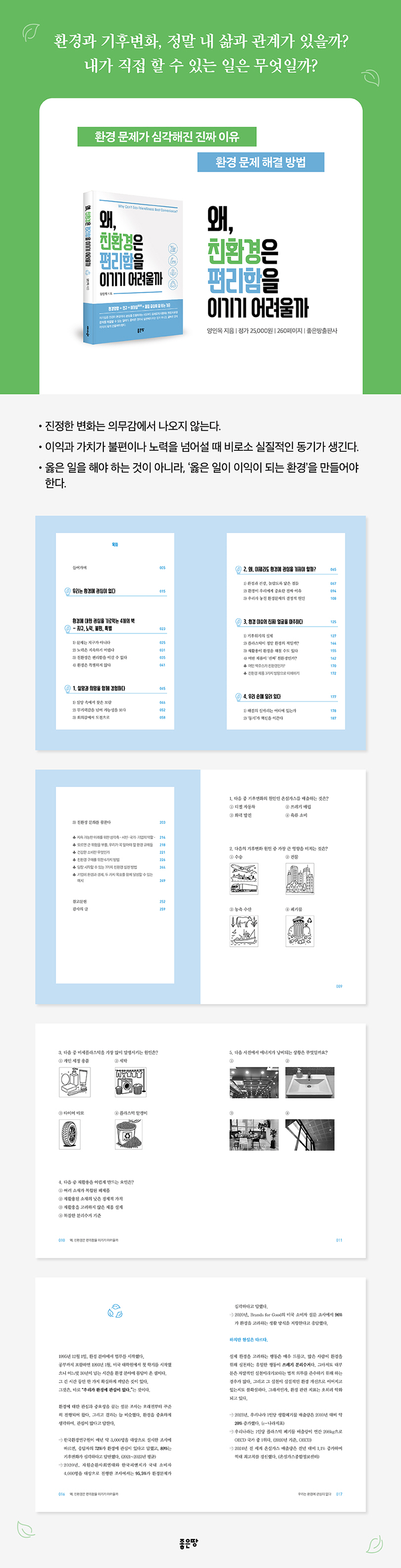 Ã¥¼Ò°³¡¶¿Ö, ģȯ°æÀº Æí¸®ÇÔÀ» À̱â±â ¾î·Á¿ï±î¡·´Â Æò¼Ò ȯ°æ¹®Á¦¿¡ °ø°¨Àº ÇÏÁö¸¸ Á¤ÀÛ ÇൿÀ¸·Î ¿Å±â±â ¾î·Á¿ü´ø À̵éÀ» À§ÇÑ Çö½ÇÀû ¾È³»¼ÀÌ´Ù. 30³â ³Ñ°Ô ȯ°æ°æ¿µ°ú ģȯ°æ Àü·«À» ¿¬±¸ÇØ ¿Â ¾çÀθñ ±³¼ö°¡ ¡°°ü½ÉÀº ÀÖÁö¸¸ ½ÇõÀ¸·Î À̾îÁöÁö ¾Ê´Â¡± ¿ì¸® »çȸ ȯ°æ ¹®Á¦ÀÇ º»Áú°ú ¡®³ë·Â¡¤ºÒÆí¡¤Æ¯º°ÇÔ¡¯À̶ó´Â ½ÇõÀÇ À庮À» ºÐ¼®Çϸç, ģȯ°æ ½ÇõÀÌ ¿Ö ¾î·Á¿îÁö¸¦ ³¯Ä«·Ó°Ô Áø´ÜÇÑ´Ù. ´Ü¼øÇÑ ¹®Á¦ Á¦±â¸¦ ³Ñ¾î, ÀÏ»ó°ú »ê¾÷, Á¦µµ Àü¹Ý¿¡¼ Áö¼Ó °¡´ÉÇÑ º¯È¸¦ À̲ø¾î³¾ ÇØ¹ý±îÁö Æø³Ð°Ô Á¦½ÃÇϰí ÀÖ´Ù. ȯ°æ°ú °æÁ¦, °³Àΰú »çȸ, Æí¸®ÇÔ°ú Ã¥ÀÓ »çÀÌÀÇ ±ÕÇüÁ¡À» °í¹ÎÇÏ´Â ¸ðµç µ¶ÀÚ¿¡°Ô ½ÇÁúÀû ÅëÂûÀ» Á¦°øÇϴ åÀÌ´Ù.
