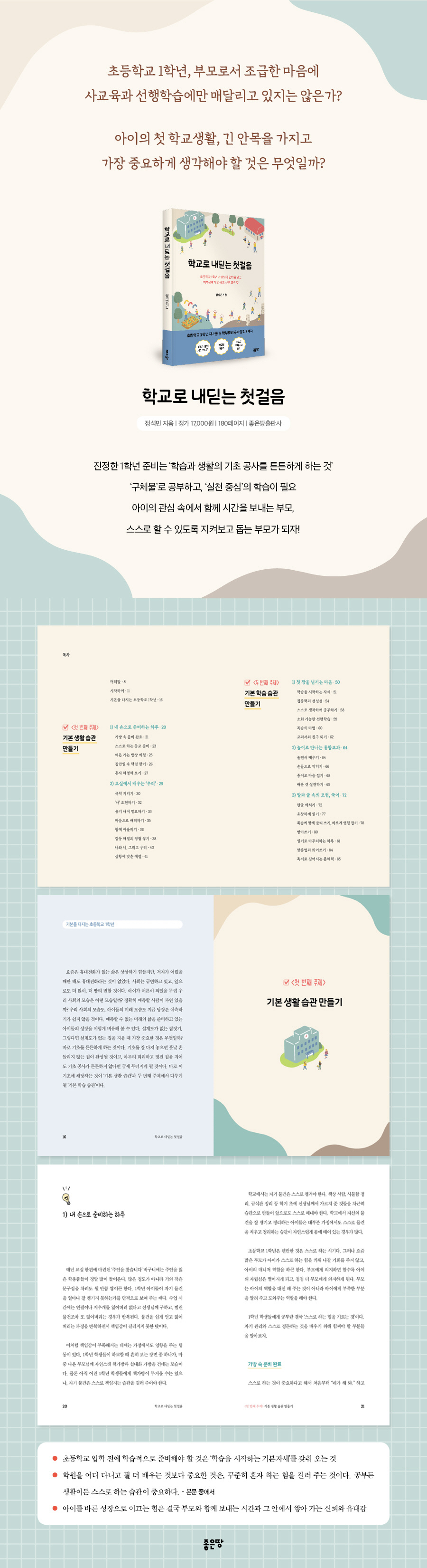 Ã¥¼Ò°³¡ºÇб³·Î ³»µó´Â ù°ÉÀ½¡»Àº ÃʵîÇб³ ÀÔÇÐÀ» ¾ÕµÐ Àڳฦ µÐ ºÎ¸ð¿¡°Ô Çб³»ýȰÀÇ ±âÃÊ¿Í ¹Ù¸¥ ½À°ü Çü¼ºÀÇ Á߿伺À» ¾Ë·Á ÁÖ´Â ¾È³»¼´Ù. ÀúÀÚ Á¤¼®¹ÎÀº ÃʵîÇб³ 1Çг⠴ãÀÓ±³»ç·Î¼ ¼ö³â°£ ¾ÆÀ̵é°ú ÇÔ²²ÇÏ¸ç ¾òÀº °æÇèÀ» ¹ÙÅÁÀ¸·Î, ºÎ¸ð°¡ °¡Àå ±Ã±ÝÇØÇÏ´Â Áú¹®µé¿¡ ´ëÇÑ ´äÀ» Á¤¸®Çß´Ù. ¡°¾ÆÀÌ¿¡°Ô ¾î¶² ½À°üÀ» ½É¾î Áà¾ß ÇÒ±î?¡±, ¡°°øºÎ´Â ¾î¶»°Ô ½ÃÀÛÇØ¾ß ÇÒ±î?¡± °°Àº °í¹Î¿¡ ´ëÇØ ÀúÀÚ´Â »ýȰ ½À°ü, ÇнÀ ½À°ü, ºÎ¸ðÀÇ ¿ªÇÒ µî Å« ÁÖÁ¦¸¦ Áß½ÉÀ¸·Î ±¸Ã¼ÀûÀÎ ÇØ¹ýÀ» Á¦½ÃÇÑ´Ù. ¾ÆÀ̰¡ ½º½º·Î Áغñ¹°À» ì±â°í, ±ÔÄ¢À» Áö۸ç, Ä£±¸¿Í ¿Ã¹Ù¸¥ °ü°è¸¦ ¸Î´Â °Í¿¡¼ºÎÅÍ ÇнÀ ŵµ¿Í µ¶¸³½ÉÀ» Ű¿ì´Â °úÁ¤±îÁö, Ãʵî 1Çг⠽ñâÀÇ ¸ðµç °ÍÀ» ´ã¾Ò´Ù.