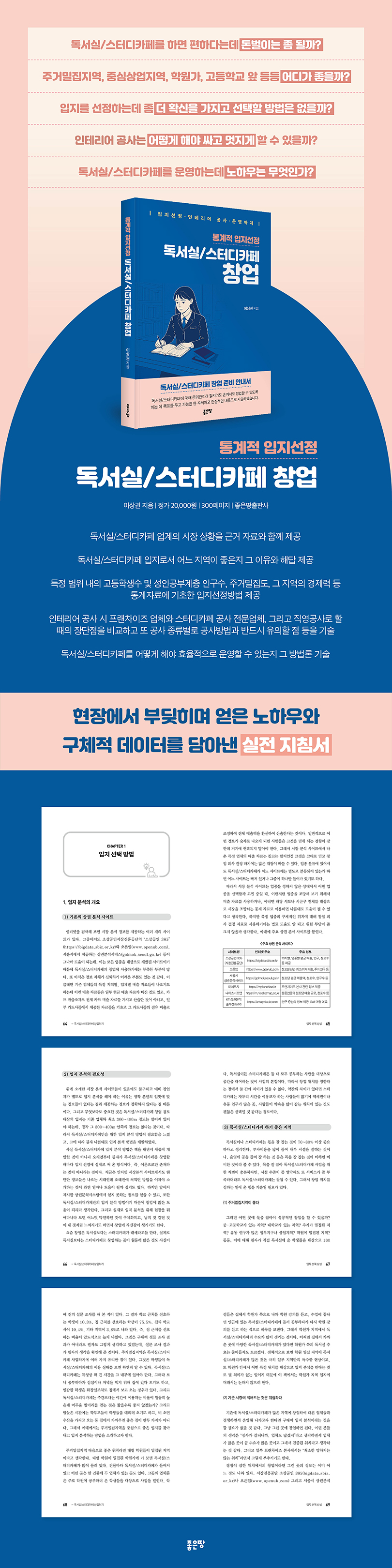 ÀúÀÚ´Â µ¶¼½Ç/½ºÅ͵ðÄ«Æä¸¦ â¾÷ÇÒ ¶§ ¹Ýµå½Ã °í·ÁÇØ¾ß ÇÒ ÇÙ½É ¿ä¼Ò·Î ¡®ÀÔÁö ºÐ¼®¡¯À» °Á¶ÇÑ´Ù. Åë°èÀû ÀڷḦ Åä´ë·Î ÁÖº¯ Àα¸ ±¸Á¶, ÁÖ°Å ¹ÐÁýµµ, °íµîÇлý ¹× ¼ºÀÎ °øºÎ °èÃþÀÇ ±Ô¸ð, °æÀï¾÷üÀÇ ºÐÆ÷ µîÀ» ¼¼¹ÐÈ÷ µûÁ®¾ß ¾ÈÁ¤ÀûÀÎ ¼öÀÍÀ» ±â´ëÇÒ ¼ö ÀÖÀ½À» ¿ª¼³ÇÑ´Ù. ½ÇÁ¦·Î Ã¥¿¡´Â Åë¹Ýº° Àα¸ Åë°è È®º¸ ¹æ¹ý, °æÀï¾÷ü ÀÌ°Ý °Å¸® Á¶»ç, Àα٠Çо÷ ¼ºÃëµµ ÆÄ¾Ç µî ü°èÀûÀÎ ºÐ¼® ¹æ¹ýÀÌ ±¸Ã¼ÀûÀ¸·Î Á¦½ÃµÇ¾î ÀÖ¾î, µ¶ÀÚµéÀÌ Á÷Á¢ Àû¿ë °¡´ÉÇÑ µµ±¸·Î Ȱ¿ëÇÒ ¼ö ÀÖ´Ù. ¶ÇÇÑ »ó°¡ °è¾à Àü ¹Ýµå½Ã È®ÀÎÇØ¾ß ÇÒ À¯Æ¿¸®Æ¼, µî±âºÎ, °ø»ç ±â°£ ÀÓ´ë·á Çù»ó °°Àº ½ÇÁúÀûÀΠüũ¸®½ºÆ®´Â â¾÷ °æÇèÀÌ ¾ø´Â À̵鿡°Ô ƯÈ÷ À¯¿ëÇÏ´Ù.