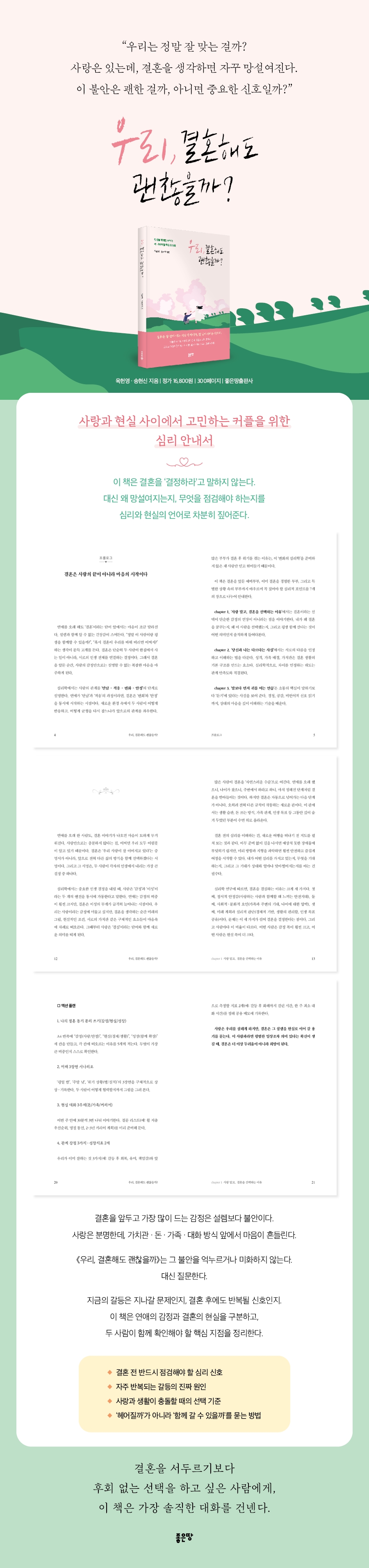 ¡®¿ì¸®, °áÈ¥ÇØµµ ±¦ÂúÀ»±î?¡¯´Â °áÈ¥À» ±ÇÇϴ åÀÌ ¾Æ´Ï¸ç, ÇÔ²² »ì¾Æ°¡´Â »îÀÌ ¾î¶² ¸¶À½ÀÇ Áغñ¸¦ ÇÊ¿ä·Î ÇÏ´ÂÁö, ±×¸®°í ±× Áغñ°¡ ÃæºÐÈ÷ ¿¬½À °¡´ÉÇÏ´Ù´Â »ç½ÇÀ» ÀüÇÑ´Ù. °áÈ¥À» °í¹ÎÇÏ´Â ¿¬Àο¡°Ô´Â ¿ë±â¸¦, ºÎºÎ¿¡°Ô´Â ´ÙÁüÀ», ´Ù½Ã °ü°è¸¦ ½ÃÀÛÇÏ·Á´Â ÀÌ¿¡°Ô´Â µû¶æÇÑ ÀÀ¿øÀ» °Ç³Ú °ÍÀÌ´Ù. °áÈ¥ÀÌ ºÒ¾ÈÇÑ ½Ã´ë¿¡, ÀÌ Ã¥Àº ¡°±×·¡µµ ÇÔ²²¡±¸¦ ¼±ÅÃÇÒ ¼ö ÀÖ´Â ÀÌÀ¯¸¦ Á¶¿ëÈ÷ µé·ÁÁÙ °ÍÀÌ´Ù. |