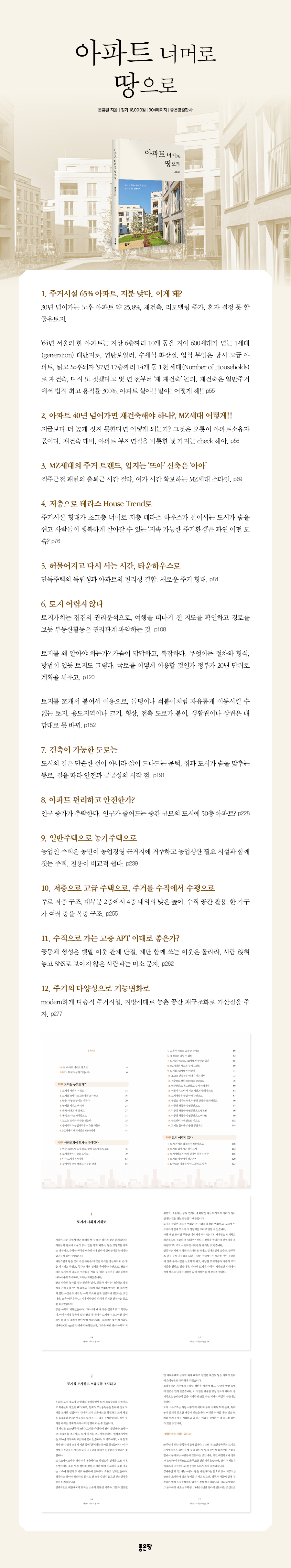 Ã¥¼Ò°³¡¶¾ÆÆÄÆ® ³Ê¸Ó·Î ¶¥À¸·Î¡·´Â ¾ÆÆÄÆ® Á᫐ ÁְŹ®È°¡ ´ç¿¬ÇØÁø ½Ã´ë¿¡ ¡°°ú¿¬ À̰ÍÀÌ À¯ÀÏÇÑ ¼±ÅÃÀΰ¡¡±¶ó´Â Áú¹®À» ´øÁö´Â Ã¥ÀÌ´Ù. ÀúÀÚ´Â ÅäÁö¸¦ ´Ü¼øÇÑ ºÎµ¿»êÀÌ ¾Æ´Ñ »îÀÇ ÅÍÀüÀÌÀÚ ¿ª»ç¡¤Á¦µµ¡¤°øµ¿Ã¼°¡ ÃàÀûµÈ °ø°£À¸·Î ¹Ù¶óº¸¸ç, ¾ÆÆÄÆ®¸¦ ³Ñ¾î Ÿ¿îÇϿ콺¡¤¿¬¸³ÁÖÅá¤ÀúÃþ ÁÖ°Å µî ´Ù¾çÇÑ ÁÖ°Å °¡´É¼ºÀ» Çö½ÇÀûÀÎ Á¦µµ¿Í »ç·Ê·Î Ç®¾î³½´Ù. ÀÌ Ã¥Àº ÁýÀÇ ÇüŸ¦ ¹Ù²ÙÀÚ´Â À̾߱Ⱑ ¾Æ´Ï¶ó, ¾î¶² °ø°£¿¡¼ ¾î¶² »îÀ» »ì °ÍÀÎÁö ½º½º·Î ´Ù½Ã »ý°¢ÇÏ°Ô ¸¸µå´Â ÁÖ°Å¡¤ÅäÁö ¿¡¼¼ÀÌ´Ù.