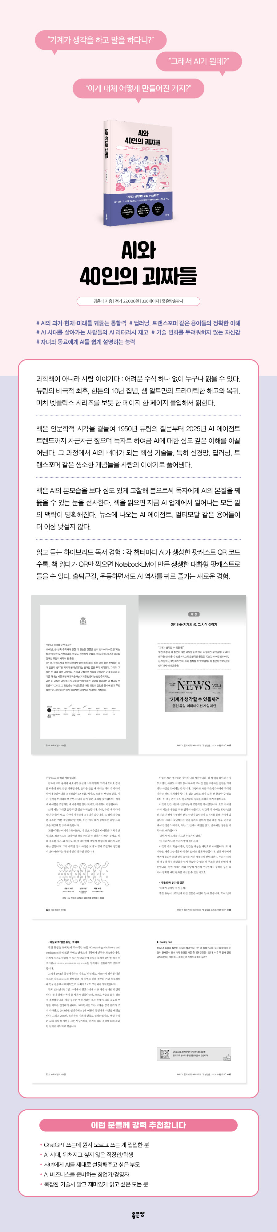 ¼¼»óÀÌ ºü¸¥ ¼Óµµ·Î AI·Î º¯Çϰí ÀÖ´Â »óȲ¿¡¼ ¡ºAI¿Í 40ÀÎÀÇ ±«Â¥µé¡»Àº AIÀÇ ½Çü¸¦ ¡®70³âÀÇ ¿ª»ç¡¯¸¦ ÅëÇØ °íÂûÇØ º½À¸·Î½á µ¶ÀÚ¿¡°Ô AIÀÇ º»ÁúÀ» ²ç¶ÕÀ» ¼ö ÀÖ´Â ´«À» ¼±»çÇÑ´Ù. Ã¥Àº Àι° Áß½ÉÀÇ µå¶ó¸¶ Çü½ÄÀ¸·Î Æ©¸µÀÇ Áú¹®ºÎÅÍ GPT ½Ã´ë±îÁö Â÷±ÙÂ÷±Ù ¤À¸¸ç AI¿¡ ´ëÇÑ ½Éµµ ±íÀº ÀÌÇØ¸¦ À̲ø¾î ³½´Ù. ±× °úÁ¤¿¡¼ AI ¿ª»çÀÇ »À´ë°¡ µÇ´Â ÇÙ½É °³³äµé, ƯÈ÷ ½Å°æ¸Á°ú µö·¯´×, Æ®·£½ºÆ÷¸Ó °°Àº »ý¼ÒÇÑ ±â¼úÀ» ºñÀ¯¿Í À̾߱â ÇüÅ·Π½±°Ô ¼³¸íÇϰí ÀÖ´Ù.