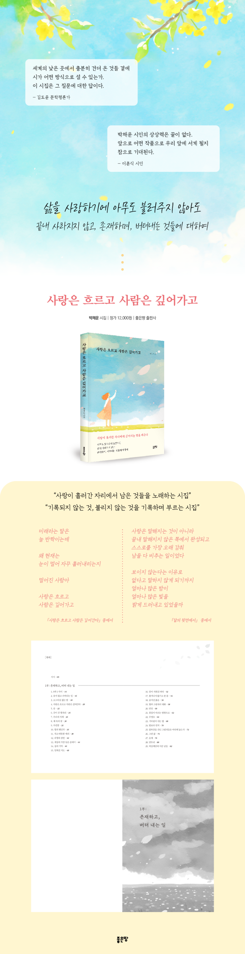 ÃâÆÇ»ç ¼Æò¹Úä¿î ½ÃÀÎÀÇ Ã¹ ½ÃÁý ¡º»ç¶ûÀº È帣°í »ç¶÷Àº ±í¾î°¡°í¡»´Â È·ÁÇÑ ¼ö»çº¸´Ù ħ¹¬ÀÇ ¹«°Ô¿¡ ÁýÁßÇÏ´Â ÀýÁ¦ÀÇ ¹ÌÇÐÀ» º¸¿©ÁØ´Ù. 2025³â µî´Ü ÀÌÈÄ ÁÖ¸ñ¹Þ¾Æ¿Â ÀúÀÚ´Â ½½¶óºê ¹®ÇÐÀ» Àü°øÇÑ À̷´ä°Ô, ¿ª»çÀû »óó¿Í °³ÀÎÀÇ ¼Ò¿ÜµÈ »îÀ» ´Ù·ç¸é¼µµ °áÄÚ °¨Á¤À» °úÀ×ÇÏ¿© µå·¯³»Áö ¾Ê´Â´Ù. ±×ÀÇ ½Ã¼±Àº ´Ã È·ÁÇÑ Á߽ɺΰ¡ ¾Æ´Ñ, À̸§ ¾ø´Â µé²ÉÀ̳ª Æó°¡ÀÇ ¿ìÆíÇÔ, ö°Å Á÷ÀüÀÇ º®¸é °°Àº '¼¼»óÀÇ °¡Àå ³·Àº Ãþ'À» ÇâÇØ ÀÖ´Ù.