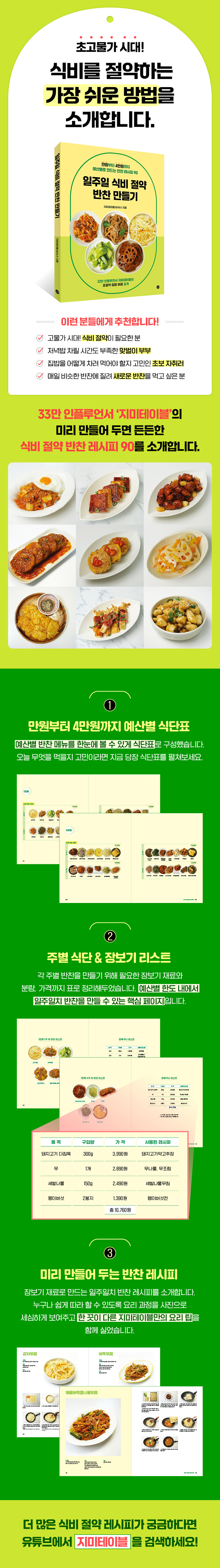 ¿Ü½Ä ¹°°¡°¡ ³Ê¹« ¿Ã¶ó ½Äºñ Àý¾àÀ» À§ÇÑ Áý¹äÀÌ ÇʼöÀÎ ½Ã´ëÀÔ´Ï´Ù. ¿¹»ê¿¡ ¸Â°Ô, Àç·á¸¦ ³²±âÁö ¾Ê°í ÀÏÁÖÀÏ¿¡ ÇÑ ¹ø ¹Ì¸® ¹ÝÂùÀ» ¸¸µé¾î µÎ¸é ¾î¶³±î¿ä? ¡®¿À´ÃÀº ¾î¶² ¹ÝÂùÀ» ÁغñÇÒ±î?¡¯·Î ¸ÅÀÏ Àú³á ³ÃÀå°í ¾ÕÀ» ¼¼ºÀÏ Çʿ䰡 ¾ø½À´Ï´Ù. 1¸¸¿øºÎÅÍ 4¸¸¿ø±îÁö °¢ÀÚÀÇ ÁÖ¸Ó´Ï »çÁ¤¿¡ ¸Â°Ô ÀÏÁÖÀÏ ÀåÀ» ºÁ¼ ÀüºÎ ´Ù ¼ÒÁøÇÏ´Â ¸Þ´ºµé. ÀÏÁÖÀÏ¿¡ ÇÑ ¹ø! ½Ã°£ ¿©À¯°¡ µÉ ¶§ ÀÌ Ã¥À» ÆîÃijõ°í ±×´ë·Î µû¶óÇϱ⸸ ÇÏ¸é ½Äºñµµ Àý¾àÇϰí, °Ç°µµ ì±æ ¼ö ÀÖ½À´Ï´Ù. ´©±¸³ª µû¶óÇϱ⠽¬¿î ·¹½ÃÇÇ·Î µ¶ÀÚµéÀÇ ½Äºñ Àý¾à Áý¹äÀ» µµ¿Íµå¸®°Ú½À´Ï´Ù.