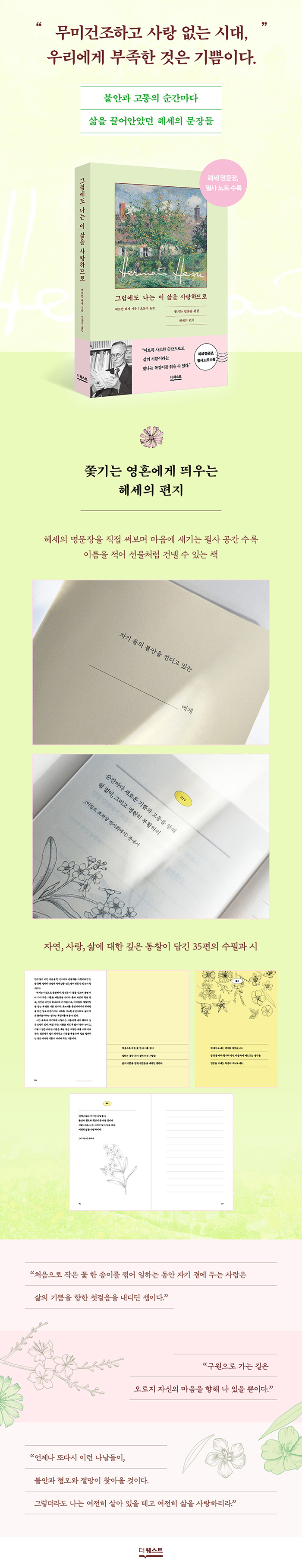 ¡¶±×·³¿¡µµ ÀÌ »îÀ» »ç¶ûÇϹǷΡ·´Â ÃÑ 3ºÎ·Î ±¸¼ºµÇ¾î ÀÖ´Ù. 1ºÎ¿¡¼´Â ÀÏ»óÀÇ »ç¼ÒÇÑ ±â»Ý°ú ÀÚ¿¬À» ÇâÇÑ Âù¹Ì, 2ºÎ¿¡¼´Â ½½Çİú °íµ¶À» °ßµð´Â Èñ¸Á, 3ºÎ¿¡¼´Â ÀÚ±â ÀÚ½ÅÀ¸·Î »ì¾Æ°¡±â À§ÇÑ Çì¼¼ÀÇ Ã¶Çаú »çÀ¯¸¦ ´ã¾Ò´Ù. ÀÌ·¯ÇÑ È帧Àº Æò»ý¿¡ °ÉÃÄ ÀÚ±â´Ù¿ò°ú ÁøÁ¤ÇÑ ÇູÀÇ Àǹ̸¦ °íÂûÇß´ø Çì¼¼ÀÇ ¹®ÇÐ Àλý°úµµ ´à¾Ò´Ù. ÀÌ Ã¥Àº ¿ì¸®°¡ °¡Àå »ç¶ûÇÑ ¹®È£ÀÇ ³»Àû ¿©Á¤À» µû¶ó°¡´Â ¼ÒÁßÇÑ ±âȸ°¡ µÇ¾îÁÙ °ÍÀÌ´Ù.