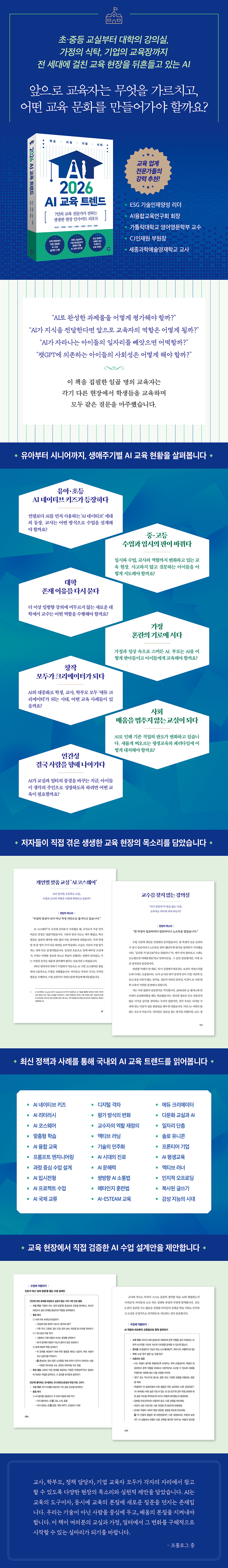 ÀÌ Ã¥Àº ±³À° ÇöÀå¿¡¼ ÀÌ·¯ÇÑ º¯ÈÀÇ È帧À» Á÷Á¢ ¸¶ÁÖÇÑ 7ÀÎÀÇ ±³À°ÀÚµéÀÌ ±â·ÏÇÑ AI Æ®·»µå ¸®Æ÷Æ®ÀÔ´Ï´Ù. °¢ÀÚÀÇ ÇöÀå¿¡¼ AI ±³À°À» ½ÇÇèÇÏ°í ½ÇÇàÇÏ¸ç °ÞÀº »ý»ýÇÑ ½ÇÁ¦ »ç·Ê¸¦ ´ã¾Ò°í, Ä¡¿ÇÑ °í¹Î°ú ½ÃÇàÂø¿À ³¡¿¡ ¾òÀº ÆÁ°ú ³ëÇÏ¿ì, ÀλçÀÌÆ®¸¦ ¾Æ³¦¾øÀÌ °øÀ¯ÇÕ´Ï´Ù. ¶Ç ±³»ç, Çкθð, Á¤Ã¥ ´ã´çÀÚ, ±â¾÷ ±³À°ÀÚ ¸ðµÎ°¡ °¢ÀÚÀÇ ÀÚ¸®¿¡¼ Âü°íÇÒ ¼ö ÀÖµµ·Ï ´Ù¾çÇÑ ÇöÀåÀÇ ¸ñ¼Ò¸®¿Í ½ÇõÀû Á¦¾ÈÀ» ´ã¾Ò½À´Ï´Ù. À̸¦ ÅëÇØ AI¸¦ Ȱ¿ëÇÑ ¼ö¾÷ ¼³°è »ç·Ê»Ó ¾Æ´Ï¶ó °¡Á¤°ú »çȸ, ±â¾÷±îÁö ¾Æ¿ì¸£´Â Àü »ý¾ÖÁÖ±âÀÇ ¸Æ¶ô ¼Ó¿¡¼ AI ±³À°À» ¹Ù¶óº¾´Ï´Ù.