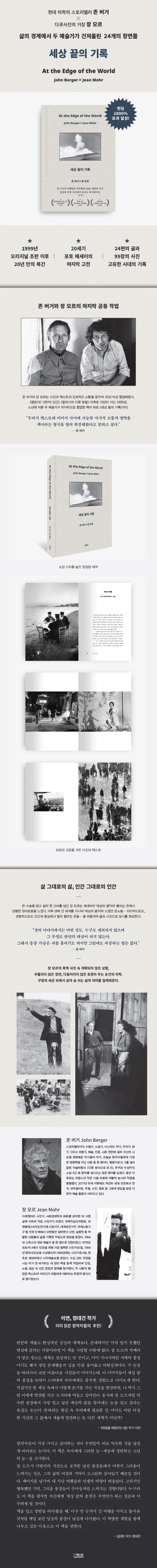 Á¸ ¹ö°Å¿Í Àå ¸ð¸£´Â 50³âÀÇ ¿ìÁ¤À» ¹ÙÅÁÀ¸·Î 1960³â´ëºÎÅÍ »çÁø°ú ±Û »çÀÌÀÇ »õ·Î¿î ´ëÈ Çü½ÄÀ» ²Þ²Ù¸ç ´Ù¾çÇÏ°Ô Çù¾÷ÇØ¿Ô´Ù. ÀÌ Ã¥Àº 20¼¼±â°¡ ³¡³ª´Â 1990³â´ë ¸», ³ë³â¿¡ À̸¥ µÎ °ÅÀåÀÌ ¡®¼¼»óÀÇ ³¡¡¯À̶ó´Â ÁÖÁ¦·Î ÇÔ²²ÇÏ¿© ´õ¿í Àǹ̰¡ ±í´Ù. Ã¥Àº Å©°Ô µÎ ÆÄÆ®·Î ±¸¼ºµÈ´Ù. »çÁø°ú ±ÛÀÇ °ü°è, ¼¼»ó ³¡¿¡ ´ëÇÑ ¼ºÂû, ´ÙÅ¥ »çÁø°¡·Î¼ Àå ¸ð¸£¿¡ ´ëÇÑ ´Ü»óÀ» ´ãÀº ¿¡¼¼À̰¡ Á¸ ¹ö°ÅÀÇ ÆÄÆ®, Å« ¼ö¼úÀ» ¹ÞÀº ÈÄ »îÀÇ °æÀ̷οòÀ» ±ú´Ý°í 40¿© ³â°£ ±â·ÏÇØ¿Â ¼¼»ó ³¡, »î°ú »ç¶÷¿¡ ´ëÇÑ À̾߱Ⱑ Àå ¸ð¸£ÀÇ ÆÄÆ®´Ù.
