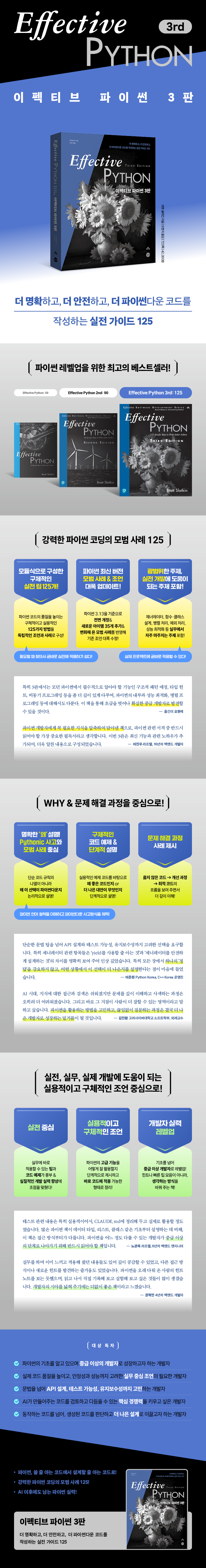 2015³â 1ÆÇÀÌ Ãâ°£µÈ ÀÌÈÄ ÆÄÀ̽ã ÇÁ·Î±×·¡¹Ö ºÐ¾ß¿¡¼ µ¶º¸ÀûÀÎ Á¸Àç°¨À» ÁöÄÑ ¿Â ¡ºÀÌÆåÆ¼ºê ÆÄÀ̽㡻Àº ÆÄÀ̽ãÀ» ¡®¾µ ÁÙ ¾Æ´Â Äڵ塯¿¡¼ ¡®¼³°èÇÒ ÁÙ ¾Æ´Â Äڵ塯·Î ²ø¾î¿Ã¸®°í, °³¹ßÀÚÀÇ ¿ª·®À» ÇÑ ´Ü°è È®Àå½ÃŰ´Â ½ÇÀü Áöħ¼´Ù. ½Ç¹«¿¡¼ ¸¶ÁÖÄ¡´Â ÇÙ½É ÁÖÁ¦¸¦ ÇÔ¼ö¿Í Á¦³Ê·¹ÀÌÅÍ, Ŭ·¡½º ¼³°èºÎÅÍ µ¿½Ã¼º, ¼º´É ÃÖÀûÈ, Å×½ºÆ®±îÁö ÃÑ 125°³ÀÇ ±¸Ã¼ÀûÀÌ°í ½Ç¿ëÀûÀÎ ¾ÆÀÌÅÛÀ¸·Î Á¤¸®Çß´Ù. °¢ ¾ÆÀÌÅÛ¿¡¼´Â ¿Ö ±× ¹æ½ÄÀÌ ´õ ³ªÀºÁö¸¦ ¸íÄèÇÑ ³í¸®¿Í »ç·Ê·Î ¼³¸íÇϰí, °¡µ¶¼º ¡¤ À¯Áöº¸¼ö¼º ¡¤ ¾ÈÁ¤¼º ¡¤ ¼º´ÉÀ» ¸ðµÎ °í·ÁÇÑ ¼³°è ¿øÄ¢À» Á¦½ÃÇß´Ù. 3ÆÇ¿¡¼´Â ÆÄÀ̽ã 3.13±îÁöÀÇ ÃֽйöÀüÀ» ±âÁØÀ¸·Î ³»¿ëÀ» Àü¸é °³Á¤Çϰí, »õ·Î¿î ¾ÆÀÌÅÛ 35°³¸¦ Ãß°¡ÇØ ÃֽŠ»ç·Ê¸¦ Ãæ½ÇÈ÷ ¹Ý¿µÇßÀ¸¸ç, ±âÁ¸ Á¶¾ð ¶ÇÇÑ º¯ÈÇØ ¿Â ¸ð¹ü »ç·Ê¸¦ ¹Ý¿µÇØ ´ëÆø ¼öÁ¤Çß´Ù. ÀÌ Ã¥Àº AI°¡ Äڵ带 ¸¸µå´Â Çö½Ã´ë¿¡ ´õ ³ªÀº ¼±ÅÃÀ» ÇÒ ¼ö ÀÖµµ·Ï °³¹ßÀÚÀÇ ¿ª·®°ú ÆÇ´Ü ±âÁØÀ» ³ô¿© ÁÙ °ÍÀÌ´Ù.
