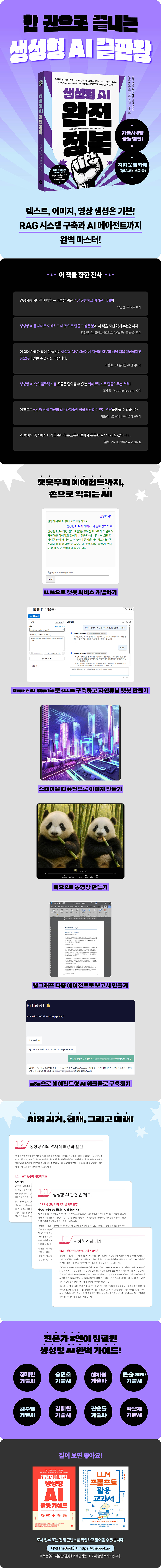 ÀÌ Ã¥Àº »ý¼ºÇü AI Àü ¿µ¿ªÀ» ü°èÀûÀ¸·Î °üÅëÇÕ´Ï´Ù. »ý¼ºÇü AIÀÇ ¿ª»ç¿Í ¹ßÀü °úÁ¤, LLMÀÇ ¿ø¸® ÀÌÇØºÎÅÍ ÇÁ·ÒÇÁÆ® ¿£Áö´Ï¾î¸µ, LLMÀ» ÀÌ¿ëÇÑ Ãªº¿ ¼ºñ½º °³¹ß, Azure AI Studio¸¦ Ȱ¿ëÇÑ RAG 꺿 ±¸Ãà±îÁö ±íÀÌ ÀÖ°Ô ´Ù·ì´Ï´Ù. ¶ÇÇÑ, ¹ÌµåÀú´Ï¿Í ´Þ¸®¸¦ ÀÌ¿ëÇÑ À̹ÌÁö »ý¼º, ¼Ò¶ó¿Í Veo 2¸¦ ÀÌ¿ëÇÑ µ¿¿µ»ó Á¦ÀÛ, CrewAI/AutoGen/LangGraph ±â¹ÝÀÇ AI ¿¡ÀÌÀüÆ® ±¸Ãà, n8nÀ» Ȱ¿ëÇÑ ¿öÅ©Ç÷ΠÀÚµ¿È±îÁö Æø³Ð°Ô ´Ù·ç¾î, ´Ü¼øÇÑ ±â¼ú ¼Ò°³¸¦ ³Ñ¾î ½Ç¹« Àû¿ë¿¡ ÃÊÁ¡À» ¸ÂÃä´Ï´Ù.