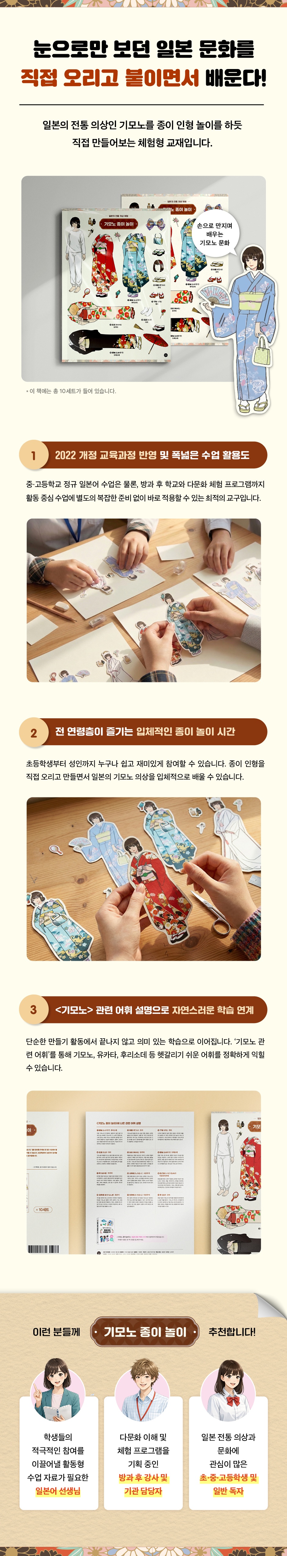 ÀÌ Ã¥Àº 2022 °³Á¤ ±³À°°úÁ¤À» ¹ÙÅÁÀ¸·Î ÇнÀÀÚ Áß½ÉÀÇ È°µ¿Çü ÄÜÅÙÃ÷¸¦ ´ã¾Ò´Ù. ƯÈ÷ Á¤±Ô ÀϺ»¾î ¼ö¾÷Àº ¹°·Ð ¹æ°ú ÈÄ È°µ¿, ´Ù¹®È ÇÁ·Î±×·¥ µî ±³À° ÇöÀå¿¡¼ ¹Ù·Î Ȱ¿ë °¡´ÉÇÑ ½Ç¿ë¼ºÀÌ °¡Àå Å« Ư¡ÀÌ´Ù. ¡¶±â¸ð³ë Á¾ÀÌ ³îÀÌ¡·´Â ÃÑ 10¼¼Æ®ÀÇ °øÀÛ È°µ¿À¸·Î ±¸¼ºµÇ¾î, Çб޺° Á¶º° Ȱµ¿À̳ª °³º° ½Ç½À¿¡ ÃÖÀûȵǾî ÀÖ´Ù. Á÷Á¢ ¸¸µå´Â °úÁ¤À» ÅëÇØ ÃʵîÇлýºÎÅÍ ¼ºÀαîÁö ´©±¸³ª ÀϺ» ÀüÅë ÀÇ»ó ¡®±â¸ð³ë¡¯¸¦ Èï¹Ì·Ó°í ÀÚ¿¬½º·´°Ô üÇèÇÒ ¼ö ÀÖ´Ù.