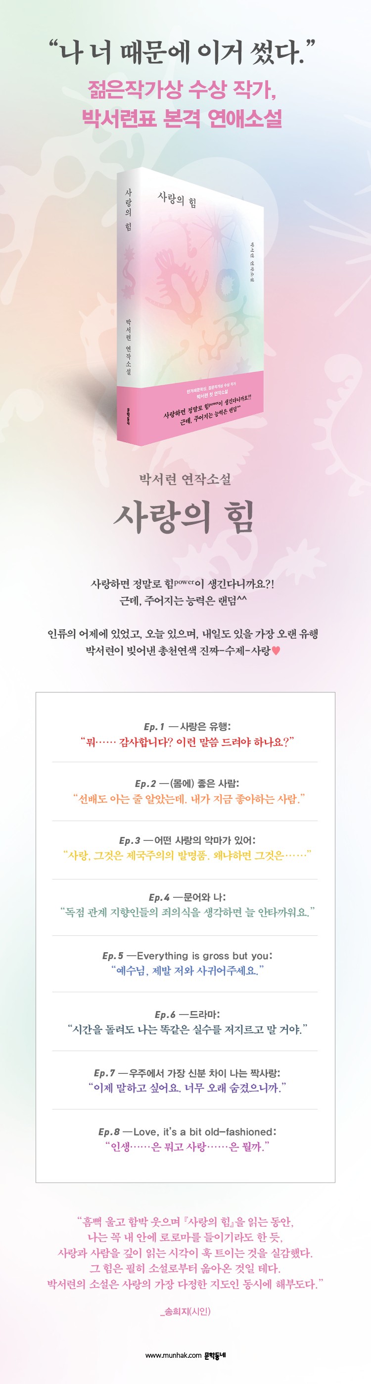 ¡°³»°¡ »ç¶ûÀ» °í¹éÇÏ´Â ¹æ¹ý °¡¿îµ¥ °¡Àå ¼º½ÇÇÑ °ÍÀÌ ¼Ò¼³ ¾²´Â ÀÏÀ̶ó¸é, ³ª´Â °áÄÚ ÀÌ »ç¶ûÀÌ ¸¶¸£°Ô µÎÁö ¾ÊÀ» °ÍÀÌ´Ù¡±(¡®¿¬À縦 ¸¶Ä¡¸ç¡¯¿¡¼)¶ó´Â ÀÛ°¡ÀÇ °á±â¸¦ ´Ù½Ã±Ý ¼ÒÈ¯ÇØº»´Ù. ¸¶Ä¡ ÀÛ°¡ Àú ÀÚ½ÅÀÌ ¼Ò¼³°ú »ç¶û¿¡ ºüÁö°í, ·Î·Î¸¶¿¡ ÈûÀÔ¾î ¿Ï¼ºÇس½ °Í¸¸ °°Àº ¡º»ç¶ûÀÇ Èû¡». ÀÌ ¿¹¿ÜÀûÀÎ ¿¡³ÊÁö¿Í °ø·ÂÀ¸·Î Áö¾îÁø Àü½ÉÀü·ÂÀÇ »ç¶û ¼Ò¼³ÀÌÀÚ »ç¶ûÀÇ Âù°¡ ¼Ó¿£ º¸ÅëÀÇ »ç¶ûµµ, Á¦Á¤½ÅÀÌ ¾Æ´Ñ »ç¶ûµµ, ´«¹°°Ü¿î »ç¶ûµµ, »ç¶ûÀΰ¡ ½ÍÀº »ç¶ûµµ Á¦°¢±â ±Ù»çÇÑ ÃÑõ¿¬»öÀ¸·Î ¹Ý¦¹Ý¦ ºû³ª°í ÀÖ´Ù.