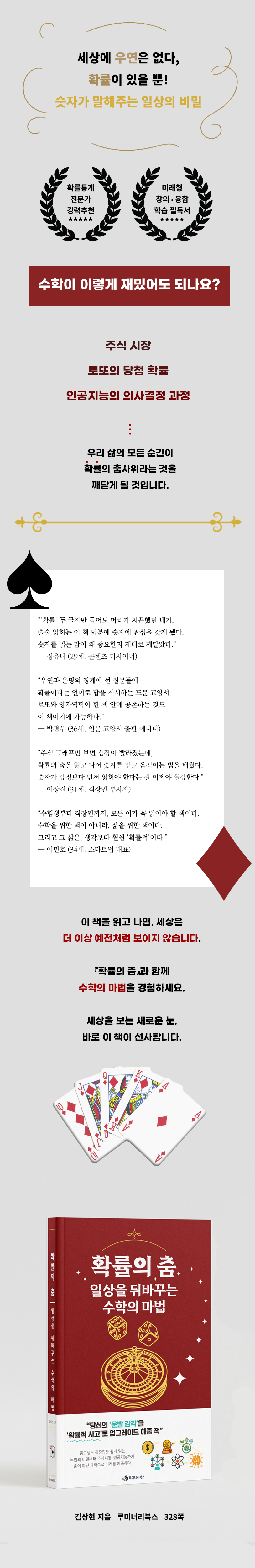 ÀÌ Ã¥Àº ¼öÇÐ ±³°ú¼ ¼Ó °³³äÀ̾ú´ø 'È®·ü'À» ÀÏ»óÀÇ ¾ð¾î·Î ´Ù½Ã ºÒ·¯³À´Ï´Ù. ´Ù¾çÇÑ ¿µ¿ª¿¡¼ ÀÛµ¿ÇÏ´Â È®·üÀÇ ¿ø¸®¸¦ Ç®¾î³»¸ç, ¼ýÀÚ¸¦ ÅëÇØ ¼¼»óÀ» ´õ ±íÀÌ ÀÌÇØÇÏ·Á´Â ½Ãµµ¸¦ ´ã°í ÀÖ½À´Ï´Ù.