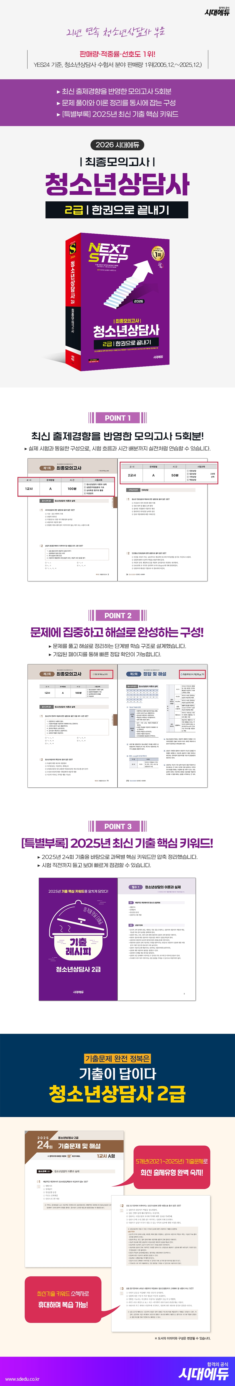 ÃâÆÇ»ç ¼Æò¼öÇ蹮ȸ¦ ¼±µµÇÏ´Â 1µî ±³À°ÃâÆÇ ½Ã´ë¿¡µà¿¡¼´Â û¼Ò³â»ó´ã»ç 2±ÞÀ» ÁغñÇÏ´Â ¼öÇè»ýµé¿¡°Ô ÇÕ°ÝÀÇ ´ç¶ôÀ» Á¿ìÇÒ ¸¶Áö¸· Á¤¸®¿Í Àü·«Àû ÇнÀÀ» µ½±â À§ÇØ º» µµ¼¸¦ Ãâ°£ÇÏ°Ô µÇ¾ú½À´Ï´Ù. ¡´2026 ½Ã´ë¿¡µà û¼Ò³â»ó´ã»ç 2±Þ ÃÖÁ¾¸ðÀǰí»ç ÇѱÇÀ¸·Î ³¡³»±â¡µ´Â ÃÖ±Ù ³ô¾ÆÁø ÃâÁ¦¼öÁØ¿¡ ¸ÂÃß¾î ¼öÇè»ýµéÀÌ ÃÖ¼ÒÇÑÀÇ ½Ã°£À¸·Î ÃÖ´ëÇÑÀÇ È¿°ú¸¦ ¾òÀ» ¼ö ÀÖµµ·Ï ´ÙÀ½°ú °°ÀÌ ±¸¼ºÇÏ¿´½À´Ï´Ù.