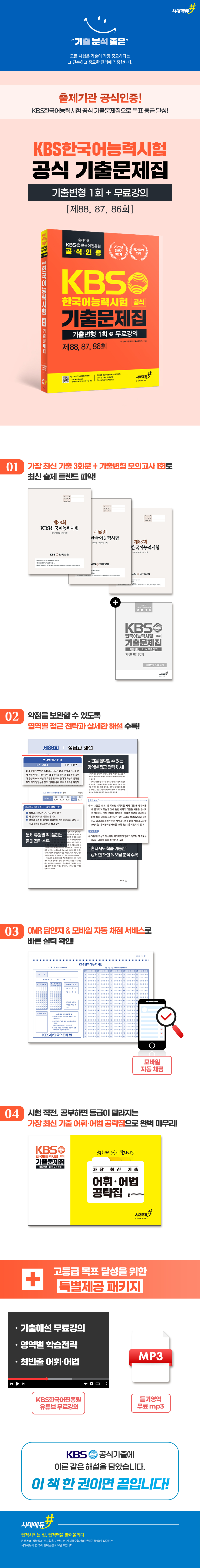 Ã¥¼Ò°³KBSÇѱ¹¾î´É·Â½ÃÇèÀÇ ÃâÁ¦±â°üÀÎ KBSÇѱ¹¾îÁøÈï¿øÀÌ Á¦°øÇÑ °¡Àå Ãֽаø½Ä ±âÃâ ¹®Á¦¿Í ºÐ¼®À» ¼ö·ÏÇÏ¿© °¡Àå »¡¸® ÃֽбâÃâ¹®Á¦¸¦ ÆÄ¾ÇÇϰí, ÃâÁ¦ Æ®·»µå¿¡ ¸Â´Â È¿À²ÀûÀÎ ÇнÀ °èȹÀ» ¼ö¸³ÇÒ ¼ö ÀÖ½À´Ï´Ù. ¶ÇÇÑ, °ø½Ä ±âÃâ Á¦88, 87, 86ȸ¿¡ ´ëÇÑ ÇØ¼³ ¹«·á°ÀǸ¦ Á¦°øÇÏ¿© ´Ù¸¥ À̷м¸¦ ã¾Æº¼ ÇÊ¿ä ¾øÀÌ º» ±³À縸À¸·Îµµ ±âÃâ¹®Á¦¿¡ ´ëÇÑ ¿ÏÀüÇÑ ÇнÀÀÌ °¡´ÉÇÏ¿© ±âÃâ¹®Á¦¸¸À¸·Îµµ KBSÇѱ¹¾î´É·Â½ÃÇèÀ» ¿Ïº®ÇÏ°Ô ´ëºñÇÒ ¼ö ÀÖ½À´Ï´Ù.