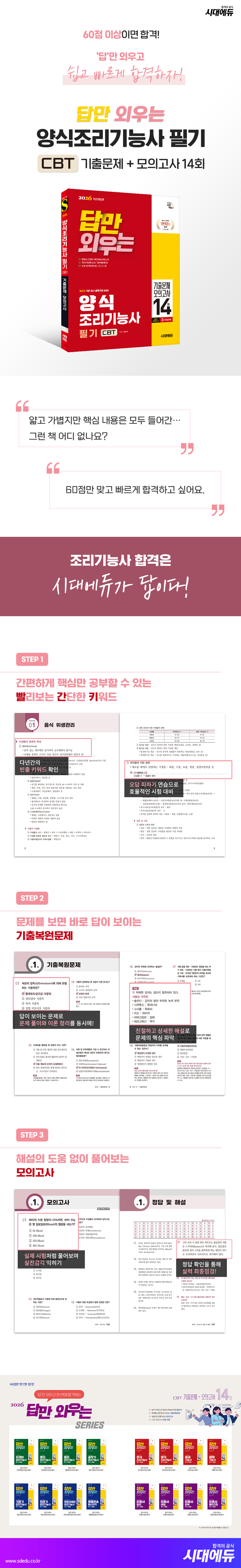 ¡°´ä¸¸ ¿Ü¿ì´Â ¾ç½ÄÁ¶¸®±â´É»ç Çʱâ CBT±âÃâ¹®Á¦+¸ðÀǰí»ç 14ȸ¡±´Â Á¤´äÀÌ ÇÑ´«¿¡ º¸ÀÌ´Â ±âÃ⺹¿ø¹®Á¦ 7ȸºÐ°ú ÇØ¼³ ¾øÀÌ Ç®¾îº¸´Â ¸ðÀǰí»ç 7ȸºÐÀ¸·Î ±¸¼ºÇÏ¿© Çʱâ½ÃÇèÀ» ÁغñÇÏ´Â µ¥ ºÎÁ·ÇÔÀÌ ¾øµµ·Ï ÇÏ¿´½À´Ï´Ù. ¶ÇÇÑ Çٽɿä¾àÁý »¡°£Å°¸¦ ÅëÇØ ½ÃÇè¿¡ ¿Ïº®ÇÏ°Ô ´ëºñÇÒ ¼ö ÀÖ½À´Ï´Ù. |