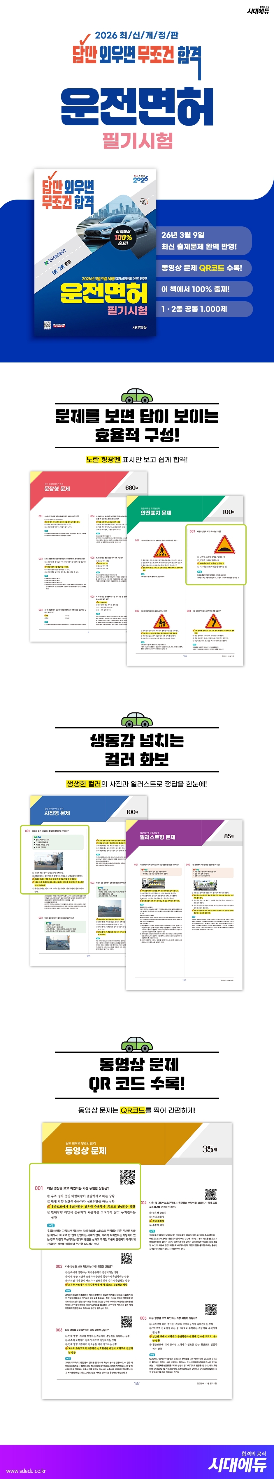 ÃâÆÇ»ç ¼ÆòÀÌ Ã¥Àº Çѱ¹µµ·Î±³Åë°ø´Ü¿¡¼ Á¦°øÇÑ Ãֽй®Á¦¸¦ ¼ö·ÏÇÑ ÃÖ½ÅÆÇ µµ¼·Î, 2026³â 3¿ù 9ÀϺÎÅÍ ½ÃÇàµÇ´Â ¹®Á¦µéÀÌ ¸ðµÎ ¼ö·ÏµÇ¾î ÀÖ½À´Ï´Ù. ¿îÀü¸éÇã Çаú½ÃÇè ¹®Á¦´Â ÀÌ ¹®Á¦Áý¿¡¼ 100% ÃâÁ¦µË´Ï´Ù. ½Ã´ë¿¡µà°¡ ÁغñÇÑ ´ä¸¸ ¿Ü¿ì´Â ¿îÀü¸éÇã Çհݰø½ÄÀ¸·Î ´Ü¼û¿¡ ÇÕ°ÝÀÇ ±â»ÝÀ» ¸Àº¸½Ã±æ ¹Ù¶ø´Ï´Ù. |