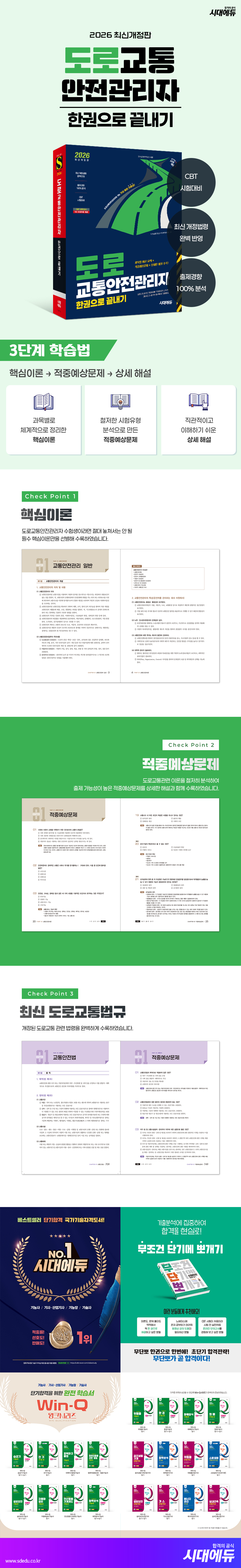 Ã¥¼Ò°³ÀÌ Ã¥¿¡´Â µµ·Î ºÐ¾ßÀÇ ±³Åë¾ÈÀü°ü¸®ÀÚ ÀÚ°ÝÁõÀ» ÃëµæÇÏ·Á´Â »ç¶÷µéÀ» ´ë»óÀ¸·Î ÃâÁ¦±âÁØ¿¡ ¸Â°Ô Çʼö°ú¸ñÀÎ ±³Åë¹ý±Ô, ±³Åë¾ÈÀü°ü¸®·Ð, ÀÚµ¿Â÷Á¤ºñ¿Í ¼±Åðú¸ñ Áß ±³Åë½É¸®ÇÐÀ» Á¦¿ÜÇÑ ÀÚµ¿Â÷°øÇÐ, ±³Åë»ç°íÁ¶»çºÐ¼®°³·Ð ÀÌ·ÐÀ» ¼ö·ÏÇϰí ÀÖ½À´Ï´Ù. °¢ PART¸¶´Ù »ó¼¼ÇÑ ÀÌ·Ð ¼³¸í°ú ´õºÒ¾î ÁÖ¿ä ¿äÁ¡µéÀ» Áß¿ä Check Point·Î ±¸¼ºÇÏ¿© ½ÃÇè¿¡ ´ëºñÇÒ ¼ö ÀÖµµ·Ï ÇÏ¿´½À´Ï´Ù. ¶ÇÇÑ ÃÖ±Ù ÃâÁ¦°æÇâÀ» ¼¼¹ÐÇÏ°Ô ºÐ¼®ÇÏ¿© CHAPTERº° ÀûÁß¿¹»ó¹®Á¦¸¦ ¼ö·ÏÇÏ¿´À¸¸ç, Ãֽа³Á¤¹ý·ÉÀ» ¹Ý¿µÇÏ¿© ÇÑÃþ ´õ ¿Ïº®ÇÑ À̷м·Î¼ÀÇ ±æÀ» Á¦½ÃÇÏ¿´½À´Ï´Ù. ÀÌ Ã¥Àº µµ·Î±³Åë¾ÈÀü°ü¸®ÀÚ ½ÃÇèÀ» ÁغñÇÏ´Â ¸ðµç Çлýµé¿¡°Ô °¡Àå ºü¸¥ ÇÕ°ÝÀÇ Áö¸§±æÀÌ µÉ °ÍÀÔ´Ï´Ù.