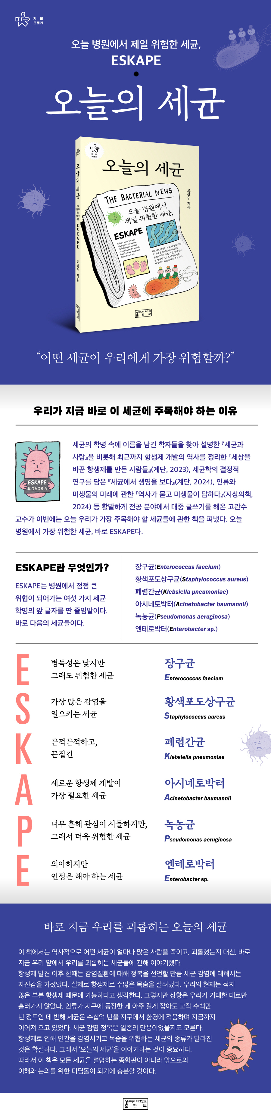 ¼¼±ÕÀÇ ÇÐ¸í ¼Ó¿¡ À̸§À» ³²±ä ÇÐÀÚµéÀ» ã¾Æ ¼³¸íÇÑ ¡º¼¼±Õ°ú »ç¶÷¡»À» ºñ·ÔÇØ ÃÖ±Ù±îÁö Ç×»ýÁ¦ °³¹ßÀÇ ¿ª»ç¸¦ Á¤¸®ÇÑ ¡º¼¼»óÀ» ¹Ù²Û Ç×»ýÁ¦¸¦ ¸¸µç »ç¶÷µé¡»(°è´Ü, 2023), ¼¼±ÕÇÐÀÇ °áÁ¤Àû ¿¬±¸¸¦ ´ãÀº ¡º¼¼±Õ¿¡¼ »ý¸íÀ» º¸´Ù¡»(°è´Ü, 2024), Àηù¿Í ¹Ì»ý¹°ÀÇ ¹Ì·¡¿¡ °üÇÑ ¡º¿ª»ç°¡ ¹¯°í ¹Ì»ý¹°ÀÌ ´äÇÏ´Ù¡»(Áö»óÀÇÃ¥, 2024) µî Ȱ¹ßÇÏ°Ô Àü°ø ºÐ¾ß¿¡¼ ´ëÁß ±Û¾²±â¸¦ ÇØ¿Â °í°ü¼ö ±³¼ö°¡ À̹ø¿¡´Â ¿À´Ã ¿ì¸®°¡ °¡Àå ÁÖ¸ñÇØ¾ß ÇÒ ¼¼±Õµé¿¡ °üÇÑ Ã¥À» Æì³Â´Ù. ¿À´Ã º´¿ø¿¡¼ °¡Àå À§ÇèÇÑ ¼¼±Õ, ¹Ù·Î ESKAPE´Ù.