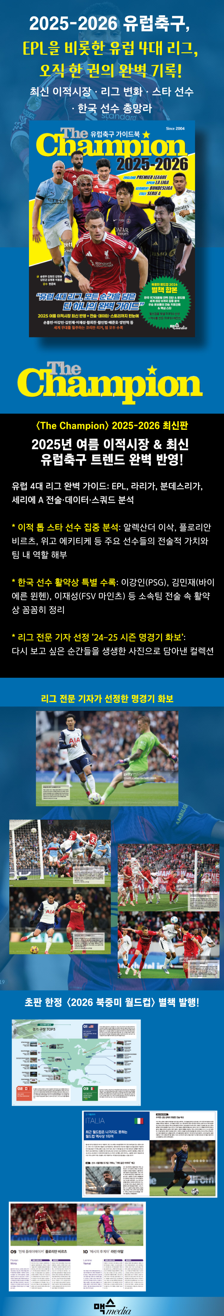 ¡¶The Champion¡·Àº ¸Å ½ÃÁð Àü ¼¼°è Ã౸ ÆÒµé¿¡°Ô °¡Àå ½Å·Ú¹Þ´Â À¯·´Ã౸ °¡À̵åºÏÀ¸·Î ÀÚ¸®¸Å±èÇØ ¿Ô´Ù. À̹ø ¡¶The Champion 2025-2026¡·Àº À¯·´Ã౸ÀÇ °¡Àå Å« º¯È¸¦ ¹Ý¿µÇÏ¿©, ÆÒµé¿¡°Ô ´õ ±íÀÌ ÀÖ°í Á¤È®ÇÑ Á¤º¸¸¦ Á¦°øÇÑ´Ù.