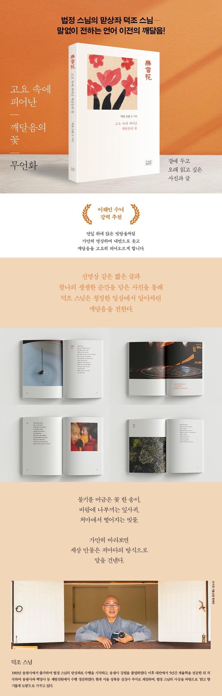 ¹°±â¸¦ ¸Ó±ÝÀº ²É ÇÑ ¼ÛÀÌ, ¹Ù¶÷¿¡ ³ªºÎ³¢´Â ÀÙ»ç±Í, 󸶿¡¼ ¶³¾îÁö´Â ºø¹°. °¡¸¸È÷ ¹Ù¶óº¸¸é ¼¼»ó ¸¸¹°Àº Àú¸¶´ÙÀÇ ¹æ½ÄÀ¸·Î ¸»À» °Ç³Ù´Ù. ´öÁ¶ ½º´ÔÀº ¡¶¹«¾ðÈ¡·¿¡¼ ħ¹¬À¸·Î ¿ÀÈ÷·Á ´õ ±íÀº ´ëȰ¡ µÈ´Ù°í ¾ê±âÇÑ´Ù. ªÀº ¼±¸í»ó°ú °°Àº ±Û, Âû³ªÀÇ »ý»ýÇÑ ¼ø°£À» ´ãÀº »çÁøÀ» ÅëÇØ ´öÁ¶ ½º´ÔÀº ûÁ¤ÇÑ Àϻ󿡼 ¾Ë¾ÆÂ÷¸° ±ú´ÞÀ½À» ÀüÇÑ´Ù.