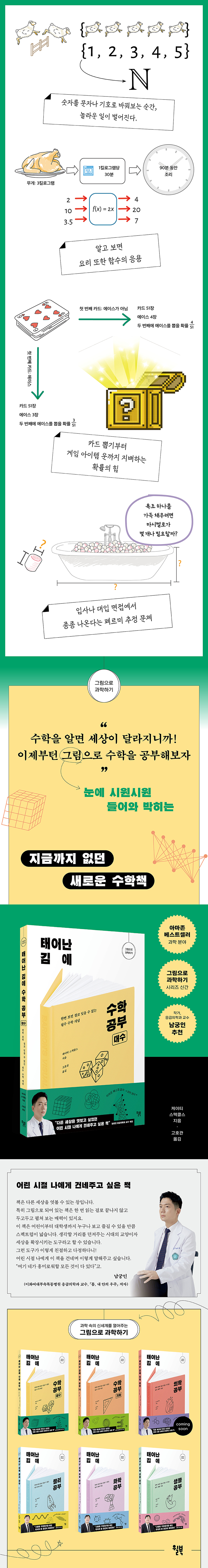 ÀÚ¿¬¼ö¿Í ¼Ò¼ö °°Àº ±âÃÊ ÁßÀÇ ±âÃʺÎÅÍ Áø¹ý, ¼ö¿, ÇÔ¼ö¿Í ¾Ë°í¸®Áò, Åë°è, ÁýÇÕ, º¤ÅÍ, ¼ö¸® ³í¸®ÇÐ, ³ª¾Æ°¡ ÀÌ»ê¼öÇаú ¼±Çü´ë¼öÇбîÁö Çʼö °³³äµéÀ» ¾ö¼±Çؼ ´ã¾Ò´Ù. ÀÌ Ã¥ ÇÑ ±ÇÀ̸é Áß¡¤°íµîÇб³ ±³°ú°úÁ¤¿¡¼ ´Ù·ç´Â ´ë¼öÇÐÀÇ ÇÙ½ÉÀ» Á¤¸®ÇÏ´Â °ÍÀº ¹°·ÐÀ̰í, ´ëÇÐ Àü°ø °øºÎµµ µçµçÈ÷ ´ëºñÇÒ ¼ö ÀÖ°Ô µÈ´Ù. ÀÌÈ¿©´ëºÎ¼Ó¸ñµ¿º´¿ø ÀÀ±ÞÀÇÇаú ±³¼ö ³²±ÃÀÎÀº ´Ù¸¥ ¼¼»óÀ» ¿³º¸°í ½Í¾ú´ø ¾î¸° ½ÃÀýÀÇ Àڽſ¡°Ô °Ç³×ÁÖ°í ½ÍÀº Ã¥À̶ó¸ç, ¡°±×¸²Ã¥Àº Çѹø Àд °É·Î ³¡³ªÁö ¾Ê°í µÎ°íµÎ°í ÆîÃÄ º¸´Â ¸Å·ÂÀÌ ÀÖ´Ù¡±°í, ±×¸²Ã¥ ¼ÓÀÇ µðÅ×ÀÏÀº ¿À·¡µµ·Ï ±â¾ï¿¡ ³²´Â´Ù°í Àû±Ø ÃßõÇß´Ù. AIÀÇ ±Þ¹ßÀüÀ» ºñ·ÔÇØ ¿¹Ãø ºÒ°¡´ÉÇÏ°Ô º¯ÇÏ´Â ¼¼»ó¿¡¼, ¼öÇÐÀ» ¸ð¸£°í »ç´Â °ÍÀº ³Ê¹« ºÒ¸®ÇÏ´Ù. ¼öÇаú ÄÚµå ¼Ó¿¡ µ¹¾Æ°¡´Â ¼¼»ó¿¡¼ žÀ¸´Ï, ÀÌ¿ÕÀÌ¸é ¼öÇÐÀ» ¾Æ´Â »ç¶÷À¸·Î »ì¾Æº¸ÀÚ.