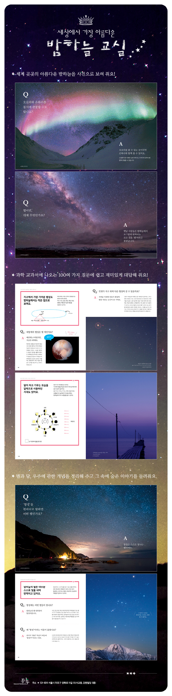 ¡¶¼¼»ó¿¡¼ °¡Àå ¾Æ¸§´Ù¿î ¹ãÇÏ´Ã ±³½Ç¡·¿¡ ´ã±ä ¹ãÇÏ´Ã »çÁøÀº õü Àü¹® »çÁø°¡µéÀÌ Àü ¼¼°è¸¦ µ¹¸ç ¿À·£ ±â´Ù¸² ³¡¿¡ Æ÷ÂøÇÑ Àå¸éµéÀÔ´Ï´Ù. º°°ú ¿ìÁÖ¿¡ ´ëÇÑ È£±â½É°ú ½Åºñ·Î¿î ±¤°æÀ» Æ÷ÂøÇϱâ À§ÇÑ ³ë·ÂÀÌ °í½º¶õÈ÷ ´ã±ä »çÁøµéÀÌÁö¿ä. º½, ¿©¸§, °¡À», °Ü¿ïÀÇ º°ÀÚ¸®¿Í ¿À·Î¶ó, ÀºÇϼö¿Í À¯¼º¿ì ±×¸®°í ¿ùÈ«ÀÌ ³ª ÀÏ½Ä °°Àº µ¶Æ¯ÇÑ Çö»ó±îÁö ³õÄ¡Áö ¾Ê°í º¸¿© ÁÝ´Ï´Ù. Ã¥ °÷°÷¿¡ ÆîÃÄÁö´Â ³î¶ó¿î ¹ãÇÏ´Ã ±¤°æ¸¸À¸·Îµµ º°°ú ¿ìÁÖ, õ¹®Çп¡ ºüÁ®µé°Ô ÇÒ ¸¸ÇÑ Ã¥ÀÔ´Ï´Ù.