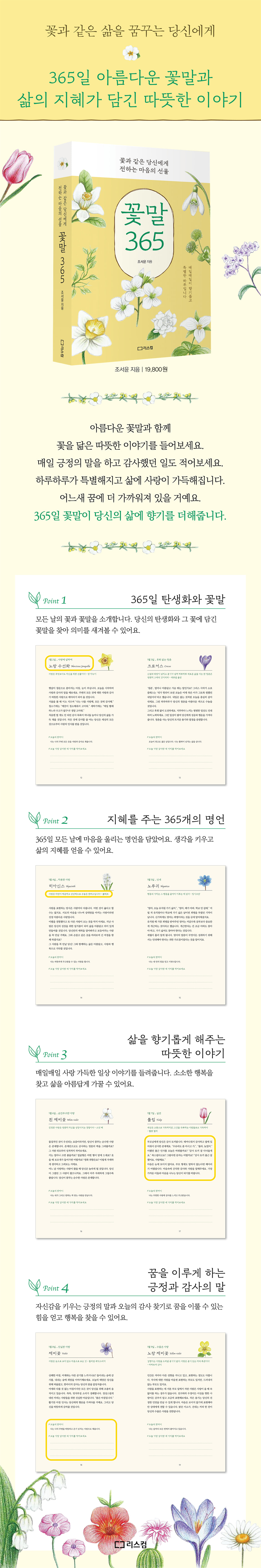 3¿ù 1ÀÏÀº ¼ö¼±È, 7¿ù 5ÀÏÀº ¶óº¥´õ¡¦ ¸ðµç ³¯¿¡´Â ²ÉÀÌ ÀÖ½À´Ï´Ù. ±×¸®°í ¸ðµç ²É¿¡´Â ¾Æ¸§´Ù¿î ²É¸»ÀÌ ÀÖÁö¿ä. ²É¸»Àº Àç¹Ì¿Í Àǹ̸¦ ÇÔ²² Áà¿ä. ÀÌ Ã¥Àº 365ÀÏÀÇ ²É¸»À» ÅëÇØ »îÀ» ¾Æ¸§´ä°Ô °¡²ã³ª°¡´Â ÁöÇý¸¦ ¾Ë·ÁÁÝ´Ï´Ù.