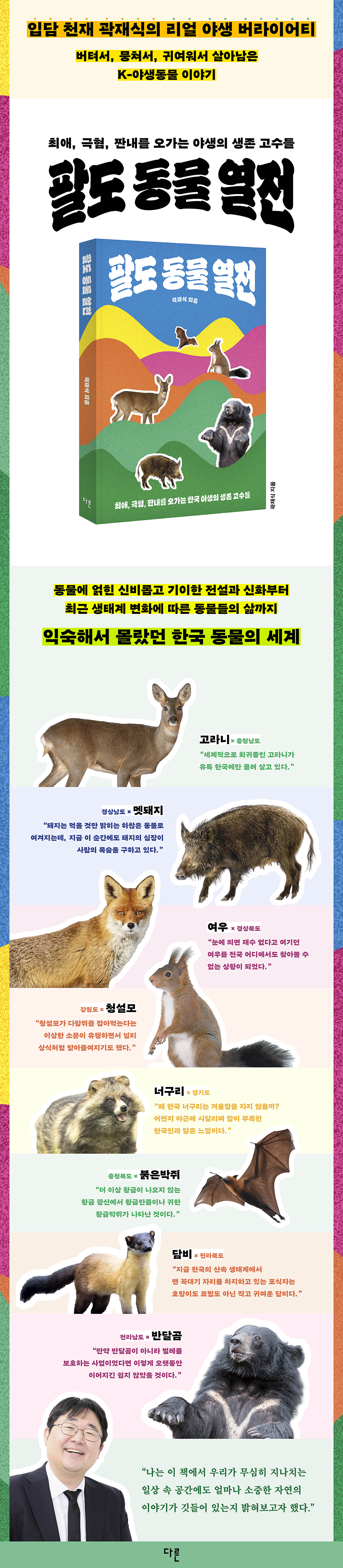 ¡¶ÆÈµµ µ¿¹° ¿Àü¡·Àº °úÇÐÀÚÀÌÀÚ ¼Ò¼³°¡ÀÎ °ûÀç½Ä ÀÛ°¡°¡ Çѱ¹ Àü¿ªÀ» ¹«´ë·Î ¾ß»ýµ¿¹°µéÀÇ ¼û°ÜÁø À̾߱⸦ ÆîÄ¡´Â Ã¥ÀÌ´Ù. °¢ µ¿¹°ÀÇ µ¶Æ¯ÇÑ ½À¼º°ú »ýÅÂ, ¼³È ¼Ó »ó¡, »çȸ¹®ÈÀû Àṉ̀îÁö µÎ·ç ´Ù·é´Ù. ¡¶»ï±¹»ç±â¡· ¼Ó ¹éÁ¦ ¸ê¸ÁÀ» ¿¹¾ðÇÑ ±«¹°ÀÇ Á¤Ã¼, ¹Ì¿ò¹Þ´ø ¿©¿ì°¡ °©Àڱ⠸êÁ¾ À§±â¿¡ óÇÑ ÀÌÀ¯, û¼³¸ð¿Í ´Ù¶÷Á㸦 µÑ·¯½Ñ ¿ÀÇØ, ³Ê±¸¸®°¡ ±¤°ßº´ ÀüÆÄÀÚ°¡ µÈ ¹æ¹ý, ¹ÚÁãÀÇ µå¶óŧ¶ó °°Àº »î µî °úÇаú »ó»óÀÌ ¾î¿ì·¯Áø À̾߱⸦ µé·ÁÁØ´Ù. ÀúÀÚ´Â ¡°¿ì¸®°¡ ¹«½ÉÈ÷ Áö³ªÄ¡´Â ÀÏ»ó ¼Ó °ø°£¿¡µµ ¾ó¸¶³ª ¼ÒÁßÇÑ ÀÚ¿¬ÀÇ À̾߱Ⱑ ±êµé¾î ÀÖ´ÂÁö ¹àÇôº¸°íÀÚ Çß´Ù¡±¶ó°í ¸»ÇÑ´Ù. ÀÌ Ã¥À» ÅëÇØ ±×µ¿¾È º¸ÀÌÁö ¾Ê¾Ò´ø ÀÚ¿¬ÀÇ ¸ð½ÀÀ» »õ·Ó°Ô ¹ß°ßÇÏ°Ô µÉ °ÍÀÌ´Ù.