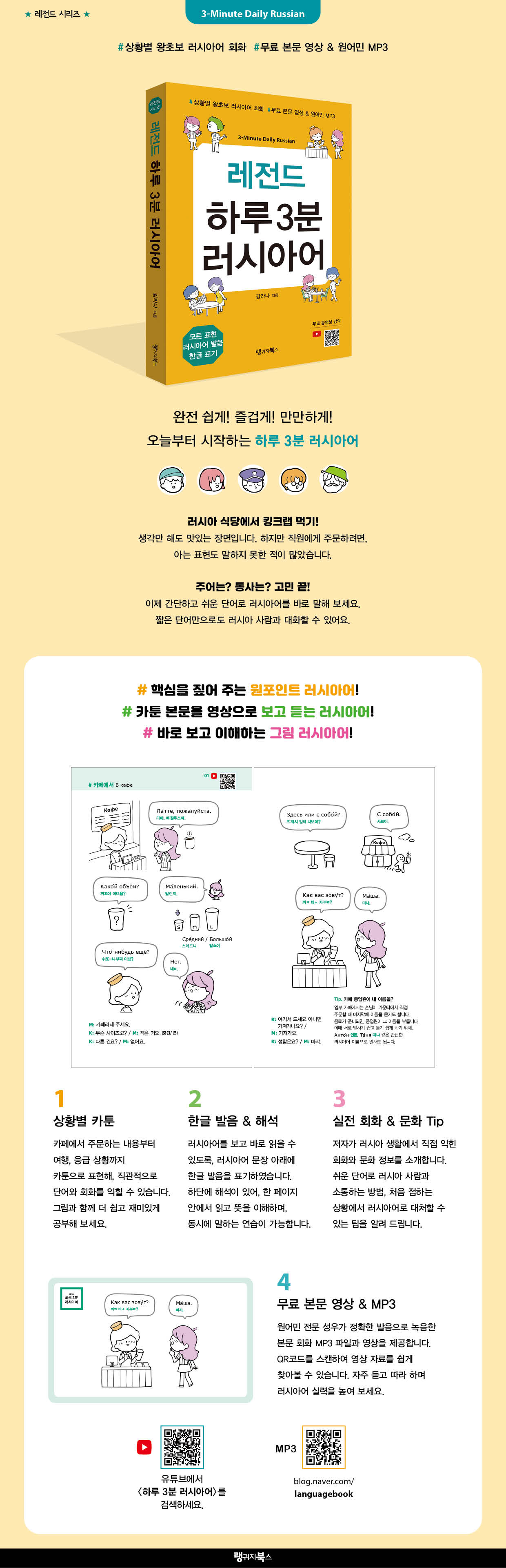 ¿À´ÃºÎÅÍ ½±°Ô! Áñ°Ì°Ô! ¸¸¸¸ÇϰÔ! ¿À´ÃºÎÅÍ ½ÃÀÛÇÏ´Â ÇÏ·ç 3ºÐ ·¯½Ã¾Æ¾î # ÇÙ½ÉÀ» ¤¾î ÁÖ´Â ¿øÆ÷ÀÎÆ® ·¯½Ã¾Æ¾î! ·¯½Ã¾Æ¾î´Â °£´ÜÇÑ ´Ü¾î·Î ½±°Ô ¸»ÇÏ¸é µË´Ï´Ù. Àϻ󿡼 ¸¹ÀÌ ¾²´Â ·¯½Ã¾Æ¾î ´Ü¾î¸¸À¸·Î ÃæºÐÈ÷ ·¯½Ã¾Æ »ç¶÷°ú ´ëȰ¡ °¡´ÉÇÕ´Ï´Ù. ´Ù¾çÇÑ »óȲ¿¡¼ ¼ÒÅëÇÒ ¼ö ÀÖµµ·Ï ÁÖÁ¦º°·Î Æ÷ÀÎÆ®°¡ µÉ ·¯½Ã¾Æ¾î ´Ü¾î¸¸À» ²À ¤¾î ¾Ë·Á µå¸³´Ï´Ù. # Ä«Å÷ º»¹®À» ¿µ»óÀ¸·Î º¸°í µè´Â ·¯½Ã¾Æ¾î! ·¯½Ã¾Æ¾î´Â ¾î·Æ°Ô °øºÎÇÏ¸é ¹Ù·Î Áú¸³´Ï´Ù. ²ÙÁØÈ÷ ÇÒ ¼ö ÀÖ´Â ÇÏ·ç ÇнÀ·®ÀÌ Áß¿äÇѵ¥, Á¤È®ÇÑ ¹ßÀ½À¸·Î ³ìÀ½ÇÑ ¿ø¾î¹Î Àü¹® ¼º¿ìÀÇ À½¼º°ú ÇÔ²² ¸¸È Çü½ÄÀÇ º»¹®À» ¿µ»óÀ¸·Î Áñ°Ü º¸¼¼¿ä. ¸ÅÀÏ, Á¶±Ý¾¿, ºÎ´ã ¾øÀÌ ÇÏ´Ù º¸¸é, ¾î´À ¼ø°£ ·¯½Ã¾Æ¾î°¡ µé¸®°í ¸»µµ ÇÏ°Ô µË´Ï´Ù. # ¹Ù·Î º¸°í ÀÌÇØÇÏ´Â ±×¸² ·¯½Ã¾Æ¾î! ·¯½Ã¾Æ¾î´Â ¾ËÆÄºª¸¸ ºÁµµ ¾î·Á¿ï »Ó¸¸ ¾Æ´Ï¶ó ¿Ü¿ì·Á¸é ¸Ó¸®°¡ ¾ÆÇÅ´Ï´Ù. ±×¸²À» ÅëÇØ »óȲÀ» ¿¬»óÇϸç, ·¯½Ã¾Æ¾î·Î ¸»ÇØ º¸¼¼¿ä. Á÷°üÀûÀ¸·Î ÀÌÇØÇÏ¸é ±â¾ï¿¡ ¿À·¡ ³²½À´Ï´Ù. ¡´·¹Àüµå ÇÏ·ç 3ºÐ ·¯½Ã¾Æ¾î¡µ Ã¥°ú ¿µ»ó ÀڷḦ ÅëÇØ, ·¯½Ã¾Æ¾î°¡ ¸¸¸¸ÇØÁö±æ ¹Ù¶ø´Ï´Ù! ÃâÆÇ»ç ¼Æò1. »óȲº° Ä«Å÷