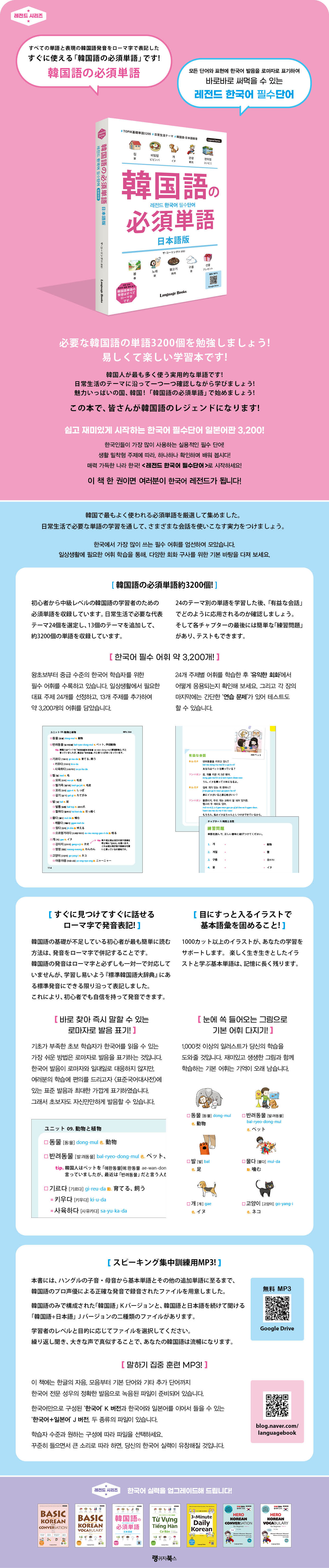 Çѱ¹ ¹®ÈÀÇ ¼¼°è ÁøÃâÀÌ È°¹ßÇØÁö¸é¼, Çѱ¹¾î¿¡ ´ëÇÑ °ü½Éµµ °¥¼ö·Ï ³ô¾ÆÁö°í ÀÖ½À´Ï´Ù. ÇÑ·ù ½ºÅ¸ÀÇ È°¾à°ú Çѱ¹ ¹®È ÄÜÅÙÃ÷ÀÇ Àαâ·Î, Çѱ¹ ¹®È¸¦ Áñ±â´Â ¿Ü±¹ÀεéÀ» ¸¸³ª´Â °ÍÀÌ ÀÌÁ¦´Â ÈçÇÑ ÀÏÀÌ µÇ¾ú½À´Ï´Ù. Çѱ¹¾î´Â ÀϺ»¾î¿Í ºñ½ÁÇÑ ¹®¹ý ±¸Á¶µµ ÀÖ°í À¯»çÇÑ ¹ßÀ½ÀÇ ´Ü¾îµéÀÌ ¸¹À¸¸ç, °°Àº ÇÑÀÚ ¹®È±ÇÀ̶ó ÀϺ»ÀÎÀÌ Á¢±ÙÇϱ⠽¬¿î ¿Ü±¹¾îÀÔ´Ï´Ù. ¿©±â¿¡ Çѱ¹¾î¿Í Çѱ¹ ¹®È¿¡ ´ëÇÑ °ü½É°ú ¿Á¤ÀÌ ´õÇØÁö¸é Àç¹ÌÀÖ°Ô ÇнÀÇÒ ¼ö ÀÖÀ» °ÍÀÔ´Ï´Ù. ¡´·¹Àüµå Çѱ¹¾î Çʼö´Ü¾î¡µ´Â ½ÇÁ¦ ȸȿ¡¼ ÀÚÁÖ »ç¿ëµÇ´Â ´Ü¾îÀÇ ¸ðÀ½À¸·Î, »çÀüÀÇ Çʼö ¾îÈÖ¿¡¼ºÎÅÍ ±Þº¯ÇÏ´Â ½Ã´ëÀû »óȲÀ» ÃÖ´ëÇÑ ¹Ý¿µÇÑ ´Ü¾îµé±îÁö ¼ö·ÏÇÏ¿´½À´Ï´Ù. ±×¸®°í ÇнÀÀÚÀÇ ÆíÀǸ¦ À§ÇØ ¸ðµç Çѱ¹¾î ´Ü¾î¿Í ¿¹¹®À» ·Î¸¶ÀڷΠǥ±âÇÏ¿´°í, ³ìÀ½À» µè°í ¿ø¾î¹ÎÀÇ Á¤È®ÇÑ ¹ßÀ½À» µû¶ó ÇÒ ¼ö ÀÖµµ·Ï MP3 À½¿øÀÌ ÀÖ½À´Ï´Ù. ØåÕôªË?ªÁª¿?¡¢ùÛ?¡¢ ¡¸ùÛ?åÞªÎù±âÎ?åÞ¡¹ª«ªéã·ªáªÞª·ªçª¦¡£ ùÛ?ÙþûùªÎá¦Í£òäõóª¬üÀ?ªËªÊªê¡¢ùÛ?åÞªË?ª¹ªë?ãýªâªÞª¹ªÞª¹ ÍԪުêƪ¤ªÞª¹¡£ùÛ×µ«¹«¿?ªÎüÀ帪ÈùÛ?Ùþûù«³«ó«Æ«ó«ÄªÎìÑ?ªÇ¡¢ ùÛ?Ùþûùªò?ª·ªàèâ?ìѪËõó?ª¦ª³ªÈª¬ÐѪǪÏòÒª·ª¤ª³ªÈªÇªÏªÊª¯ ªÊªêªÞª·ª¿¡£ùÛ?åުϡ¢ìíÜâåÞªÈÙþÛöϰð㪬ÞĪƪ¤ªÆ¡¢?ë媬׾ÞĪ·ª¿?åÞªâÒýª¯¡¢ ÔÒª¸ùÓí®Ùþûù?ªÇª¢ªëª¿ªá¡¢ìíÜâìѪ˪ȪêÆ?㧪·ªäª¹ª¤èâ?åުǪ¹¡£ª³ªìªËùÛ?åÞªäùÛ?ÙþûùªË?ª¹ªëýéÚ«ªÈï׿ðª¬Ê¥ªïªìªÐ¡¢?ª·ª¯?ªÙªëªÇª·ªçª¦¡£ ¡¸ùÛ?åÞªÎù±âÎ?åÞ¡¹ªÏ¡¢?ð·ªÎ?ü¥ªÇªèª¯ÞŪïªìªë?åÞªòó¢ªáª¿ªâªÎªÇ¡¢ ?ßöªÎù±âÎåÞýĪ«ªé¡¢Ùͪު°ªëª·ª¤ãÁÓÛªÎ?ûùªòªÇªªëªÀª±Úã籪·ª¿?åÞªÞªÇ??ª·ªÆª¤ªÞª¹¡£ª½ª·ªÆ¡¢?ã§íºªÎøµëñªÎª¿ªá¡¢ª¹ªÙªÆªÎùÛ?åުΠ?åÞªÈÖÇÙþªË«í?«Þí®øúÑÀªòÜõª±¡¢«Í«¤«Æ«£«Ö«¹«Ô?««?ªÎïáü¬ªÊ?ëåªò ü¬ìãªÇªªëMP3ëå깪âÜõ?ª·ªÆª¤ªÞª¹¡£ ÃâÆÇ»ç ¼ÆòÇѱ¹¿¡¼ °¡Àå ¸¹ÀÌ ¾²´Â Çʼö ¾îÈÖ¸¦ ¾ö¼±ÇÏ¿© ¸ð¾Ò½À´Ï´Ù. ÀÏ»ó»ýȰ¿¡ ÇÊ¿äÇÑ ¾îÈÖ ÇнÀÀ» ÅëÇØ, ´Ù¾çÇÑ È¸È ±¸»ç¸¦ À§ÇÑ ±âº» ¹ÙÅÁÀ» ´ÙÁ® º¸¼¼¿ä.