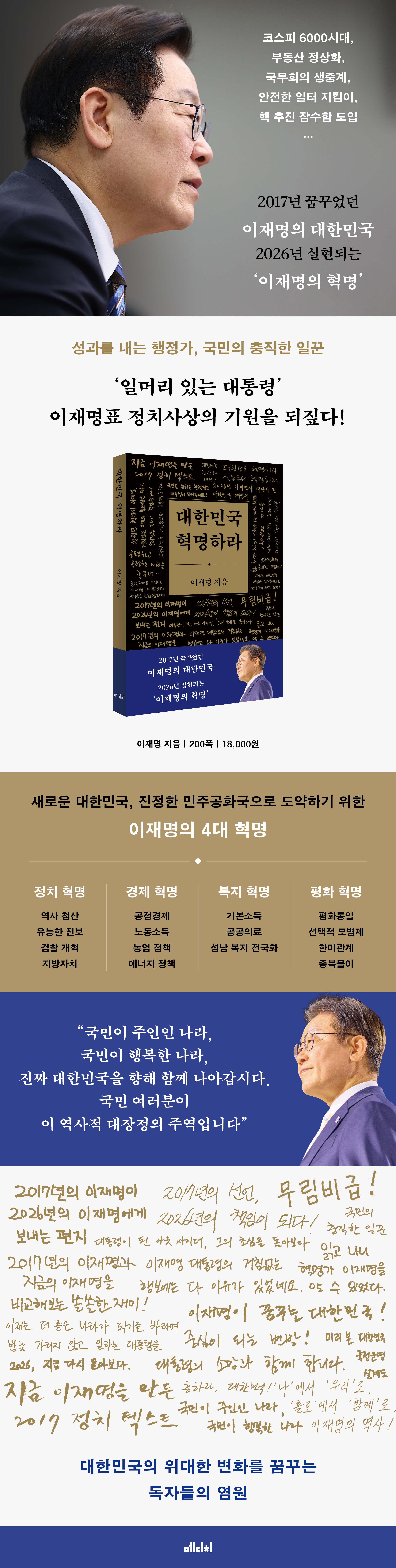 ÀÌÀç¸í ´ëÅë·É ÃëÀÓ ÀÌÈÄ, Á¤Ä¡ÀÎ ÀÌÀç¸íÀÇ ÃʽÉÀ» ±Ã±ÝÇØÇÏ´Â µ¶ÀÚµéÀÌ ¸¹¾Ò´Ù. ¡¶´ëÇѹα¹ Çõ¸íÇ϶ó¡·ÀÇ ÀçÃâ°£Àº ¹Ù·Î ÀÌ·¯ÇÑ µ¶ÀÚµéÀÇ ¹Ù¶÷¿¡ ºÎÀÀÇÑ °ÍÀÌ´Ù. ¸®Ä¿¹öÆÇÀº ´ëÇѹα¹ÀÇ À§´ëÇÑ º¯È¸¦ ²Þ²Ù´Â µ¶ÀÚµéÀÇ ¿°¿øÀ» Ã¥ Ç¥Áö¿¡ ´ã¾Æ³Â´Ù. µû¶ó¼ ÀÌ Ã¥Àº ¡®2017³âÀÇ ÀÌÀç¸íÀÌ 2026³âÀÇ ÀÌÀç¸í¿¡°Ô ¹Ì¸® º¸³½ ÆíÁö¡¯ÀÏ »Ó ¾Æ´Ï¶ó ¡®±¹¹ÎÀÌ ´ëÅë·É¿¡°Ô º¸³»´Â ÆíÁö¡¯À̱⵵ ÇÑ ¼ÀÀÌ´Ù. ÀÌÀç¸íÀÇ ÃʽÉÀ» ´ãÀº ¡¶´ëÇѹα¹ Çõ¸íÇ϶󡷴 ´ëÇѹα¹°ú ÀÌÀç¸í, ±×¸®°í ±¹¹ÎÀÌ ¹Ì·¡·Î ³ª¾Æ°¡´Â µ¥ ºÏ±Ø¼ºÀÌÀÚ ³ªÄ§¹Ý ¿ªÇÒÀ» ÇÒ °ÍÀÌ´Ù.
