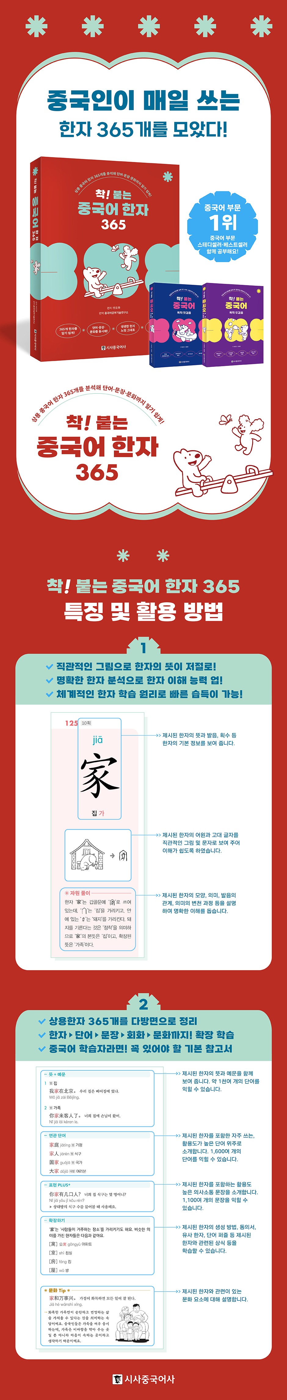365°³ÀÇ Áß±¹¾î »ó¿ë ÇÑÀÚ¸¦ ÇнÀÇÏ¸é °ü·Ã ÇÑÀÚ 1,000¿© °³, »ó¿ë ´Ü¾î 1,600¿© °³, ÀÇ»ç¼ÒÅë ¹®Àå 1,100¿© °³, Áß±¹ ¹®È ¿ä¼Ò 150°³±îÁö ÀÚ¿¬½º·´°Ô ½ÀµæÇÒ ¼ö ÀÖ¾î, ÇÑÀÚ ÀÚü´Â ¹°·Ð ´Ü¾î ¹× ȸÈ, ¹®È±îÁö È®Àå ÇнÀÀÌ °¡´ÉÇÏ¿© Áß±¹¾î ´É·ÂÀÚ·Î °Åµì³¯ ¼ö ÀÖ´Ù.