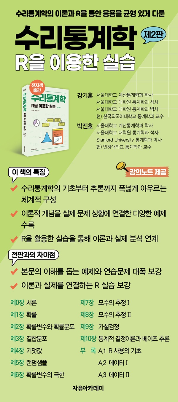 Ã¥¼ÓÀ¸·Î' µ¥ÀÌÅͰ¡ ¼¼»óÀ» ¿òÁ÷ÀÌ´Â ½Ã´ëÀÔ´Ï´Ù. Á¤Ä¡, »çȸ, °æÁ¦´Â ¹°·Ð °úÇбâ¼ú, ÀÇ·á, ±³À° µî °ÅÀÇ ¸ðµç ºÐ¾ß¿¡¼ µ¥ÀÌÅ͸¦ ±â¹ÝÀ¸·Î ÇÑ ÀÇ»ç°áÁ¤ÀÌ ÀÌ·ç¾îÁö°í ÀÖÀ¸¸ç, ±×¿¡ µû¶ó Åë°èÇÐÀÇ Á߿伺Àº ³¯·Î Ä¿Áö°í ÀÖ½À´Ï´Ù. ¹æ´ëÇÑ µ¥ÀÌÅ͸¦ ´Ü¼øÈ÷ ÀúÀåÇϰí Á¤¸®ÇÏ´Â ´Ü°è¸¦ ³Ñ¾î, °úÇÐÀûÀ̰í ÇÕ¸®ÀûÀÎ ¹æ¹ýÀ¸·Î ÇØ¼®ÇÏ°í ¼³¸íÇÏ´Â ´É·ÂÀÌ ÇÙ½É °æÀï·ÂÀ¸·Î ºÎ»óÇϰí ÀÖ½À´Ï´Ù. ÀÌ·¯ÇÑ º¯È ¼Ó¿¡¼ Åë°èÇÐÀº ´õ ÀÌ»ó ¼±ÅÃÀÌ ¾Æ´Ñ ÇʼöÀÇ Çй®À¸·Î ÀÚ¸® Àâ¾Ò°í, ±× Á߽ɿ¡´Â ¼ö¸®Åë°èÇÐ(Mathematical Statistics)ÀÌ ÀÖ½À´Ï´Ù. ¼ö¸®Åë°èÇÐÀº ´Ù¾çÇÑ Åë°è ºÐ¼® ¹æ¹ýµéÀÌ ¾î¶² ¿ø¸®¿Í ÀÌ·ÐÀû Á¤´ç¼ºÀ» ¹ÙÅÁÀ¸·Î ÀÛµ¿ÇÏ´ÂÁö¸¦ ¼³¸íÇØÁÖ´Â Çй®À¸·Î, Åë°èÀû »ç°íÀÇ ±¸Á¶¸¦ ¸¸µé°í ºÐ¼®ÀÇ ½Å·Úµµ¸¦ ³ô¿©ÁÖ´Â ±âÃÊÀÌÀÚ Áß½ÉÀÔ´Ï´Ù. ÇÏÁö¸¸ ¼ö¸®Åë°èÇÐÀº Á¾Á¾ ¼ö½Ä Áß½ÉÀÇ ÀÌ·ÐÀû ¼³¸íÀ¸·Î ÀÎÇØ ¸¹Àº ÇнÀÀڵ鿡°Ô ¾î·Æ°í Ãß»óÀûÀÎ °ú¸ñÀ¸·Î ¿©°ÜÁö°ï ÇÕ´Ï´Ù. À̸¦ ±Øº¹Çϱâ À§ÇØ, À̹ø °³Á¤ÆÇ¿¡¼´Â ±âÁ¸ÀÇ ³»¿ëÀ» À¯ÁöÇÏ¸é¼ ´ÙÀ½°ú °°Àº Á¡µéÀ» ÁßÁ¡ÀûÀ¸·Î º¸¿ÏÇÏ¿´½À´Ï´Ù. ù°, º»¹®ÀÇ ÀÌÇØ¸¦ µ½±â À§ÇÑ ¿¹Á¦¸¦ Ãß°¡ÇÏ¿´½À´Ï´Ù. °¢ ÀÌ·ÐÀÌ ½ÇÁ¦ ¹®Á¦ »óȲ¿¡¼ ¾î¶»°Ô Àû¿ëµÇ´ÂÁö¸¦ º¸¿©ÁÖ´Â ´Ù¾çÇÑ ¿¹Á¦¸¦ ÅëÇØ, µ¶ÀÚµéÀÌ ¼öÇÐÀû °³³äÀ» º¸´Ù ±¸Ã¼ÀûÀ¸·Î ü°¨Çϰí ÀÀ¿ëÇÒ ¼ö ÀÖµµ·Ï ±¸¼ºÇÏ¿´½À´Ï´Ù. µÑ°, ¿¬½À¹®Á¦¸¦ ´ëÆø È®ÃæÇÏ¿© ÇнÀÀÚ ½º½º·Î ÀÌ·ÐÀ» Á¡°ËÇϰí ü°èÀûÀ¸·Î ÈÆ·ÃÇÒ ¼ö ÀÖµµ·Ï ÇÏ¿´½À´Ï´Ù. ´Ù¾çÇÑ ³À̵µÀÇ ¹®Á¦¸¦ ÅëÇØ ÇнÀÀÇ ±íÀ̸¦ ´õÇϰí, ¹Ýº¹ÇнÀÀ» À¯µµÇÔÀ¸·Î½á ÀÌÇØµµ¸¦ ³ôÀ̰íÀÚ ÇÏ¿´½À´Ï´Ù. ¼Â°, °¢ Àå¿¡¼´Â RÀ» Ȱ¿ëÇÑ ½Ç½ÀÀ» Æ÷ÇÔÇÏ¿© À̷аú ½ÇÁ¦¸¦ ¿¬°áÇϰí, ÄÄÇ»ÅÍ ±â¹ÝÀÇ µ¥ÀÌÅÍ ºÐ¼® ȯ°æ¿¡ Àͼ÷ÇØÁú ¼ö ÀÖµµ·Ï ÇÏ¿´½À´Ï´Ù. À̸¦ ÅëÇØ ´Ü¼øÇÑ ÀÌ·Ð ¾Ï±â¸¦ ³Ñ¾î ½ÇÁúÀûÀÎ ºÐ¼® ¿ª·®À» ±â¸¦ ¼ö ÀÖµµ·Ï ÇÏ¿´½À´Ï´Ù. ÀÌ Ã¥Àº Å©°Ô µÎ ºÎºÐÀ¸·Î ±¸¼ºµÇ¾î ÀÖ½À´Ï´Ù. È®·ü°ú È®·üºÐÆ÷ µî Åë°èÀÇ ±âÃÊ ÀÌ·ÐÀ» ´Ù·é 1ÀåºÎÅÍ 6Àå±îÁö, ±×¸®°í ÃßÁ¤, °ËÁ¤, º£ÀÌÁî Ãß·Ð µî Åë°èÀû Ãß·ÐÀ» ´Ù·é 7ÀåºÎÅÍ 10Àå±îÁö·Î ³ª´ ¼ö ÀÖ½À´Ï´Ù. ÀúÀÚÀÇ °ÀÇ °æÇè¿¡ ºñÃ߾ ¶§, ÇлýµéÀÌ Æ¯È÷ ¾î·Á¿òÀ» ´À³¢´Â ºÎºÐÀº È®·üº¯¼öÀÇ ±ØÇÑÀ» ´Ù·é 6Àå, ÃÖ´ë°¡´ÉµµÃßÁ¤·®ÀÇ Á¡±ÙÀû ¼ºÁúÀ» ´Ù·é 7.5Àý, ±×¸®°í ±ÕÀÏÃÖ°·Â°ËÁ¤À» ´Ù·é 9.3ÀýÀÔ´Ï´Ù. ÀÌ Ã¥À» ±³Àç·Î Ȱ¿ëÇϽô ºÐµé²²¼´Â ¼ö¾÷ÀÇ ¼öÁذú ¸ñÀû¿¡ µû¶ó ÇØ´ç ºÎºÐÀ» »ý·«Çϰųª º¸¿ÏÇÏ¿© Á¶Á¤Çϼŵµ ¹«¹æÇÒ °ÍÀ¸·Î ÆÇ´ÜµË´Ï´Ù. ¶ÇÇÑ ÀÌ Ã¥Àº RÀÇ È°¿ëÀ» µµÀÔ ¼öÁØ¿¡¼ ´Ù·ç°í ÀÖÀ¸¸ç, Àü¹®ÀûÀÎ R ÇÁ·Î±×·¡¹Ö ±³Àç´Â ¾Æ´Õ´Ï´Ù. µû¶ó¼ R¿¡ ´ëÇÑ º¸´Ù ±íÀÌ ÀÖ´Â ÇнÀÀ» ¿øÇϽô °æ¿ì¿¡´Â º°µµÀÇ ±³À糪 ±³°ú¸ñÀ» ÅëÇØ º¸¿ÏÇнÀÀ» ÇϽô °ÍÀÌ ¹Ù¶÷Á÷ÇÕ´Ï´Ù. ÀÌ Ã¥À» ÁýÇÊÇÏ°í °³Á¤ÇÏ´Â °úÁ¤¿¡¼ ¸¹Àº ºÐµéÀÇ µµ¿òÀÌ ÀÖ¾ú½À´Ï´Ù. R »ç¿ë¹ýÀÇ ÀÛ¼º ¹× ±³Á¤ °úÁ¤¿¡´Â ´ëÇпø Á¦ÀÚµéÀÇ Á¤¼º°ú ³ë·ÂÀÌ ÇÔ²² ±êµé¾î ÀÖÀ¸¸ç, Á¦´ë·Î ¸ð¾çÀ» °®Ãá Ã¥À» ¸¸µé±â À§ÇÑ ÆíÁý ÀÛ¾÷¿¡¼´Â ÀÚÀ¯¾ÆÄ«µ¥¹Ì ÆíÁýºÎÀÇ ¼¼½ÉÇϰí Àü¹®ÀûÀÎ ¿ª·®¿¡ Å« µµ¿òÀ» ¹Þ¾Ò½À´Ï´Ù. ÀÌ ÀÚ¸®¸¦ ºô·Á ±íÀÌ °¨»çµå¸³´Ï´Ù. ÀúÀڷμ´Â ºÎÁ·ÇÑ Á¡ÀÌ ¾øµµ·Ï ½ÉÇ÷À» ±â¿ï¿´Áö¸¸ ¿©ÀüÈ÷ ¾Æ½¬¿òÀÌ ³²½À´Ï´Ù. ±×·³¿¡µµ ºÒ±¸Çϰí ÀÌ Ã¥ÀÌ Åë°èÇÐÀÇ ¼¼°è·Î ÀÌ¹Ì ¶Ù¾îµé¾ú°Å³ª, ȤÀº ±× ±æÀ» °È°íÀÚ ÇÏ´Â ºÐµé²² ÀÌ·ÐÀû ±â¹Ý°ú ºÐ¼® ¿ª·®À» ½×´Â µ¥ ÀÛ°Ô³ª¸¶ µµ¿òÀÌ µÇ±â¸¦ Áø½ÉÀ¸·Î ¹Ù¶ø´Ï´Ù. ¾ÕÀ¸·Îµµ µ¶ÀÚ ¿©·¯ºÐÀÇ µû¶æÇÑ Á¶¾ð°ú °Ç¼³ÀûÀÎ ºñÆÇÀ» ±â´ëÇϸç, °³Á¤ÆÇÀÌ º¸´Ù Ãæ½ÇÇÑ ±³Àç·Î °Åµì³¯ ¼ö Àֱ⸦ ¼Ò¸ÁÇÕ´Ï´Ù. |