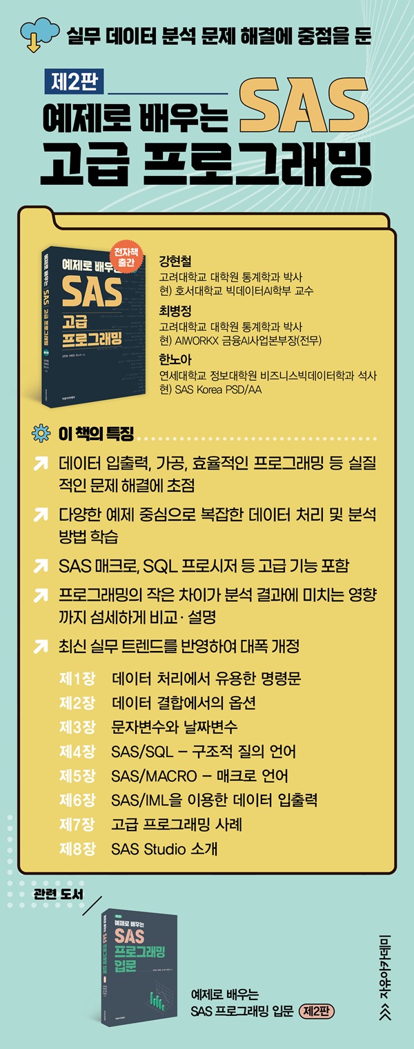 Á߹ݺÎÀÎ 4ÀåºÎÅÍ 7Àå±îÁö´Â µ¥ÀÌÅÍ Ã³¸®¸¦ À§ÇÑ SAS ¾ð¾îµéÀ» ¼Ò°³Çϰí ÀÖ´Ù. 4Àå¿¡¼´Â µ¥ÀÌÅͺ£À̽º °Ë»ö°ú °»½Å, º¸°í¼ ÀÛ¼ºÀ» À§ÇÑ ±¸Á¶Àû ÁúÀǾð¾îÀÎ SQL(Structured Query Language)À» ´Ù·ç¾ú°í, 5Àå¿¡¼´Â ¹Ýº¹ ÀÛ¾÷¿¡ À¯¿ëÇÑ SAS ¸ÅÅ©·Î ¾ð¾î¸¦, 6Àå¿¡¼´Â Çà·ÄÀ» ´Ù·ç´Â µ¥ »ç¿ëµÇ´Â IML(Interactive Matrix Language)ÀÇ µ¥ÀÌÅÍ ÀÔÃâ·Â °ü·Ã ±â´ÉÀ» ¼³¸íÇÏ¿´´Ù. 7Àå¿¡¼´Â Áö±Ý±îÁö ¹è¿î °í±Þ ÇÁ·Î±×·¡¹Ö ±â¹ýµéÀ» ½Ç¹«¿¡¼ ¾î¶»°Ô Ȱ¿ëÇÒ ¼ö ÀÖ´ÂÁö¸¦ ´Ù¾çÇÑ »ç·Ê¸¦ ÅëÇØ ´Ù·ç¾ú´Ù. À̸¦ ÅëÇØ ½ÇÁ¦ ºÐ¼® ¾÷¹«¿¡¼ ÀÚÁÖ ¸¶ÁÖÄ¡´Â ¹®Á¦ »óȲ¿¡¼ À¯¿ëÇÑ ¸ÅÅ©·Î ±¸¹®°ú SAS ÇÁ·Î±×·¡¹Ö ÆÁÀ» ÀÍÈú¼ö ÀÖÀ» °ÍÀÌ´Ù.