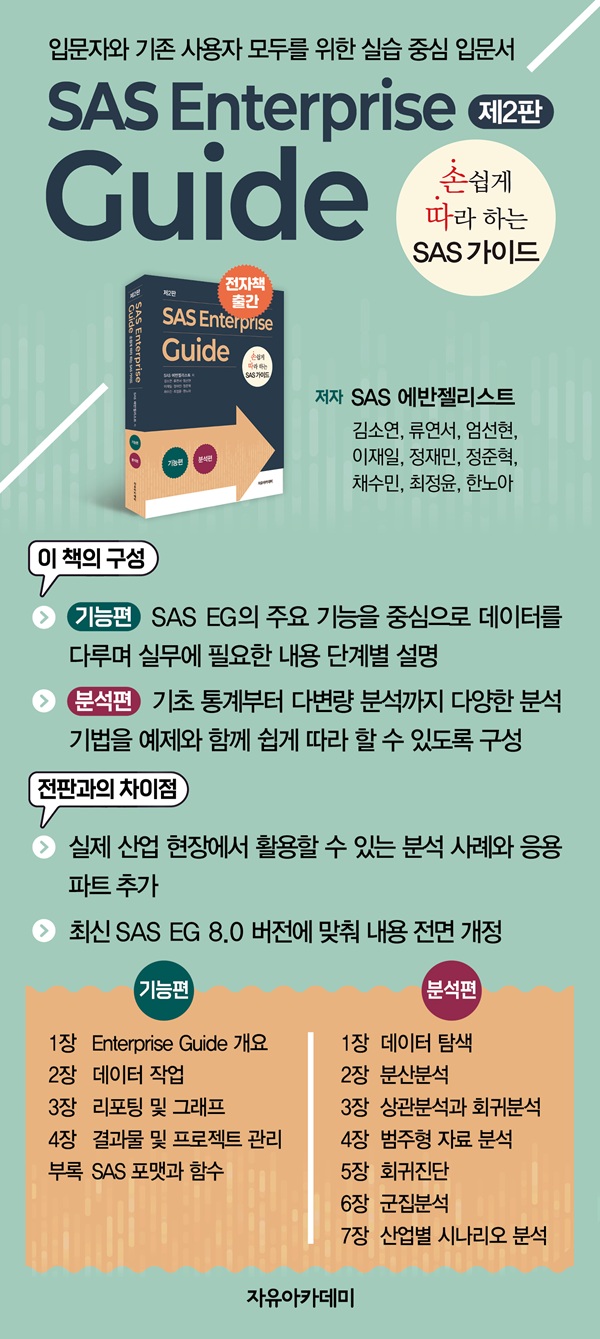 SAS EG´Â ÀÏ´Ü Àͼ÷ÇØÁö¸é ¸Å¿ì Á÷°üÀûÀÌ°í °·ÂÇÑ µµ±¸ÀÔ´Ï´Ù. ¾î¶² ºÐ¼® ÅøÀÌµç »ç¿ë¹ýÀ» ÀÍÈ÷¸é ´õ ´É¼÷ÇÏ°Ô ´Ù·ê ¼ö ÀÖ´Â °Íó·³, SAS EG ¿ª½Ã ÁÁÀº ¾È³»¼¸¦ ¸¸³´Ù¸é ±× ÀáÀç·ÂÀ» ÈξÀ È¿°úÀûÀ¸·Î ¹ßÈÖÇÒ ¼ö ÀÖ½À´Ï´Ù. ±×·¯³ª ¾Æ½±°Ôµµ SAS EG¸¦ Àü¹®ÀûÀ¸·Î ´Ù·é ¼ÀûÀº ½ÃÁß¿¡¼ Á»Ã³·³ ã¾Æº¸±â ¾î·Á¿ü½À´Ï´Ù. ÀÌ·¯ÇÑ °¥ÁõÀ» ÇØ¼ÒÇϰíÀÚ, °ú°Å SAS ¿¡¹ÝÁ©¸®½ºÆ® ¿©·¯ºÐ²²¼ ¶æÀ» ¸ð¾Æ ¡º¼Õ½±°Ô µû¶óÇÏ´Â Enterprise Guide¡»¸¦ Ãâ°£ÇÑ ¹Ù ÀÖ½À´Ï´Ù. ÀÌÈÄ¿¡µµ SAS EG´Â ²ÙÁØÈ÷ ¹ßÀüÇÏ¿© »õ·Î¿î ±â´ÉµéÀÌ Ãß°¡µÇ¾ú°í, ÃֽйöÀüÀÇ ±â´ÉÀ» ¹Ý¿µÇÑ »õ·Î¿î Áöħ¼ÀÇ Çʿ伺ÀÌ Ä¿Á³½À´Ï´Ù. ÀÌ¿¡ ÃֽŠSAS EG 8.0 ¹öÀü¿¡ ¸ÂÃç ³»¿ëÀ» Àü¸é °³Á¤ÇÏ¿© µ¶ÀÚ ¿©·¯ºÐÀ» ´Ù½Ã ¸¸³ª ºË°Ô µÇ¾ú½À´Ï´Ù.
