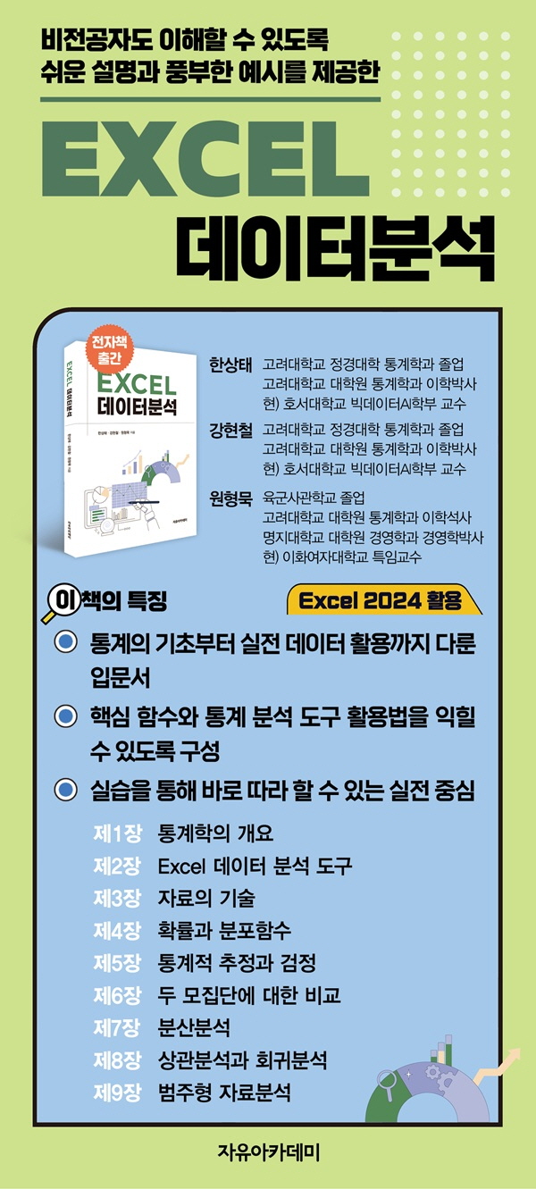 Ã¥¼Ò°³ÀÌ Ã¥Àº Åë°èÇÐ ÀÔ¹® ¼öÁØÀÇ °ú¸ñ¸¸ ¼ö°Çϰí Á¹¾÷ÇÏ´Â ÇлýµéÀ̳ª ÀÏ¹Ý µ¶ÀÚµéÀÌ °¢ÀÚ ¸ÃÀº ºÐ¾ß¿¡¼ ÇÊ¿äÇÑ ±âº»ÀûÀÎ µ¥ÀÌÅÍ ºÐ¼® ´É·ÂÀ» ±â¸¦ ¼ö ÀÖ°Ô ÇϰíÀÚ ÁýÇʵǾú´Ù. ƯÈ÷, »çȸ °¢ ºÐ¾ß¿¡¼ ³Î¸® Ȱ¿ëµÇ°í ÀÖ´Â »ç¹«¿ë ÇÁ·Î±×·¥ÀÎ ¸¶ÀÌÅ©·Î¼ÒÇÁÆ® ExcelÀ» Ȱ¿ëÇÏ¿© ÇнÀÇÔÀ¸·Î½á µ¥ÀÌÅÍ ºÐ¼®¿¡ ´ëÇÑ Ã¹ÀλóÀ» Èï¹Ì·Ó°Ô ¹Þ¾ÆµéÀÏ ¼ö ÀÖÀ» °ÍÀ¸·Î ±â´ëµÈ´Ù(ÀÌ Ã¥¿¡¼´Â Excel 2024¸¦ »ç¿ëÇϰí ÀÖ´Ù). ¶ÇÇÑ, ExcelÀÇ Åë°èºÐ¼® µµ±¸ÀÎ µ¥ÀÌÅÍ ºÐ¼® ¸Þ´º(´ëÈ»óÀÚ)¿Í Åë°èÇÔ¼ö µîÀ» ÀûÀýÈ÷ Ȱ¿ëÇÏ¿© µ¶ÀÚ°¡ Á÷Á¢ ½Ç½ÀÇÒ ¼ö ÀÖµµ·Ï ±¸¼ºÇÏ¿´À¸¹Ç·Î, À̸¦ ÅëÇØ ExcelÀ» ÀÌ¿ëÇÑ ±âº»ÀûÀÎ µ¥ÀÌÅÍ ºÐ¼® ´É·ÂÀ» ÃæºÐÈ÷ ±â¸¦ ¼ö ÀÖÀ» °ÍÀÌ´Ù.
