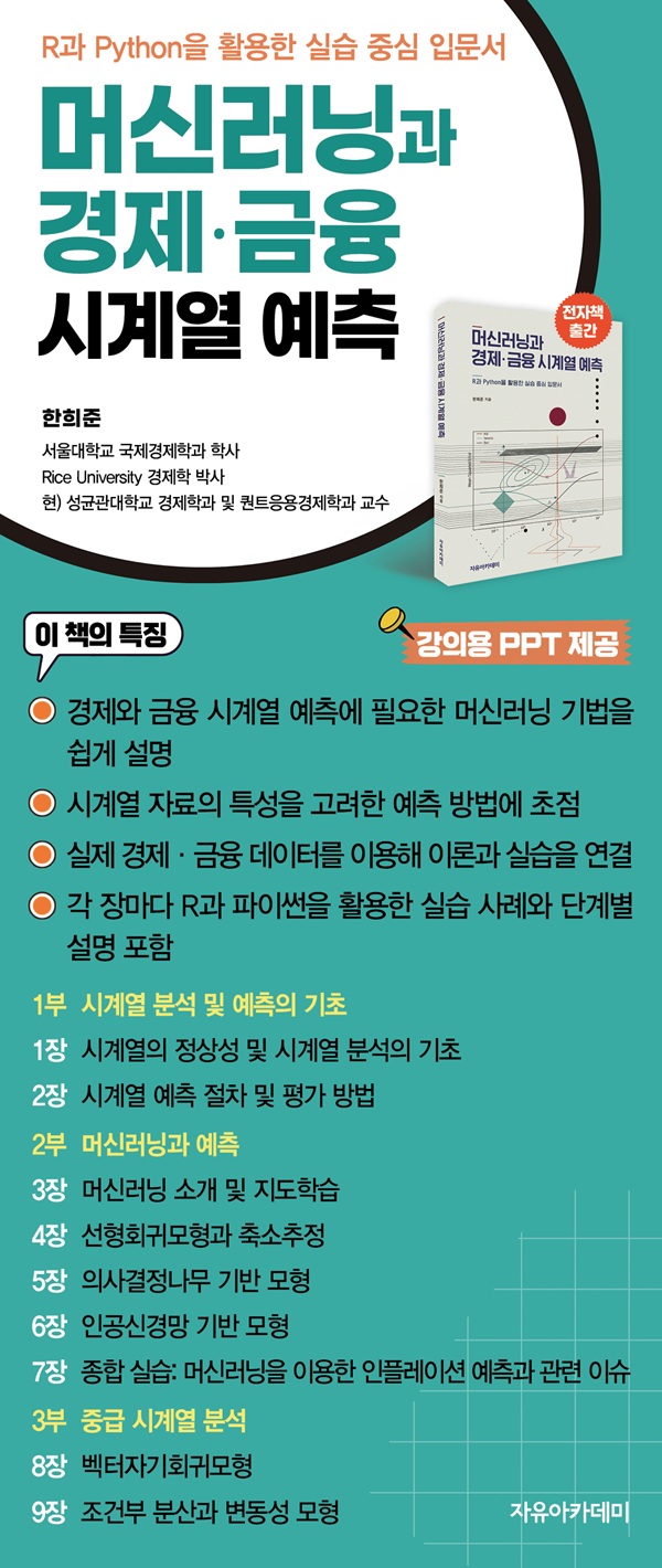 Ã¥¼Ò°³"ÀÌ Ã¥Àº °æÁ¦¿Í ±ÝÀ¶ ºÐ¾ß¿¡¼ ½Ã°è¿ µ¥ÀÌÅ͸¦ ¿¹ÃøÇÏ´Â µ¥ ÇÊ¿äÇÑ ¸Ó½Å·¯´× ±â¹ýÀ» ½±°í ü°èÀûÀ¸·Î ÀÍÈú ¼ö ÀÖµµ·Ï ±¸¼ºÇÏ¿´´Ù. ƯÈ÷ ½Ã°è¿ ÀÚ·áÀÇ Æ¯¼ºÀ» °í·ÁÇÑ ¿¹Ãø ¹æ¹ý¿¡ ÃÊÁ¡À» ¸ÂÃß¾úÀ¸¸ç, ½ÇÁ¦ µ¥ÀÌÅ͸¦ Ȱ¿ëÇÑ ½Ç½ÀÀ» ÅëÇØ µ¶ÀÚ°¡ ÀÌ·ÐÀû ÀÌÇØ¸¦ ³Ñ¾î ½ÇÁ¦ ºÐ¼®¿¡ Àû¿ëÇÒ ¼ö ÀÖ´Â ´É·ÂÀ» ±â¸¦ ¼ö ÀÖµµ·Ï µ½´Â´Ù.