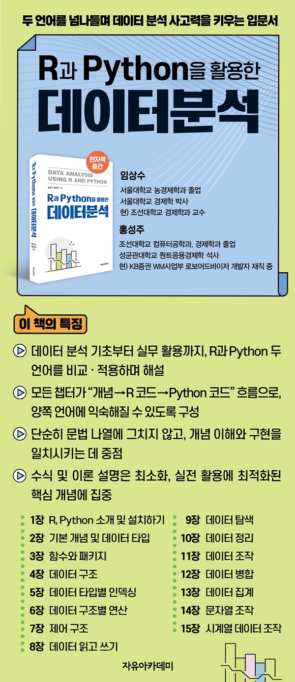 Ã¥¼Ò°³"µ¥ÀÌÅÍ ºÐ¼® ÇöÀå¿¡¼´Â ÈçÈ÷ ÇÑ °¡Áö µµ±¸³ª ¾ð¾î¸¸À¸·Î ¾÷¹«°¡ ÀÌ·ç¾îÁöÁö ¾Ê½À´Ï´Ù. Åë°è ºÐ¼®¿¡ °Á¡À» °¡Áø R°ú ¸Ó½Å·¯´× ¹× ½Ã½ºÅÛ °³¹ß¿¡¼ ³Î¸® Ȱ¿ëµÇ´Â PythonÀº ¸¹Àº ±â¾÷°ú ¿¬±¸±â°ü¿¡¼ µ¿½Ã¿¡ ¾²ÀÌ´Â ´ëÇ¥ÀûÀÎ µ¥ÀÌÅÍ ºÐ¼® ¾ð¾îÀÔ´Ï´Ù. ÆÀ ³»¿¡¼µµ ¾î¶² ±¸¼º¿øÀº RÀ», ´Ù¸¥ ±¸¼º¿øÀº PythonÀ» ¼±È£ÇÏ´Â °æ¿ì°¡ ¸¹½À´Ï´Ù. ±×·¯³ª ±âÁ¸ ±³Àç´Â ´ëºÎºÐ ÇÑ °¡Áö ¾ð¾î¸¸À» ´Ù·ç°í ÀÖ¾î, µÎ ¾ð¾î¸¦ ÇÔ²² ¹è¿ì°íÀÚ ÇÏ´Â ÇнÀÀÚ¸¦ À§ÇÑ ÅëÇÕ ±³Àç´Â µå¹® »óȲÀÔ´Ï´Ù.