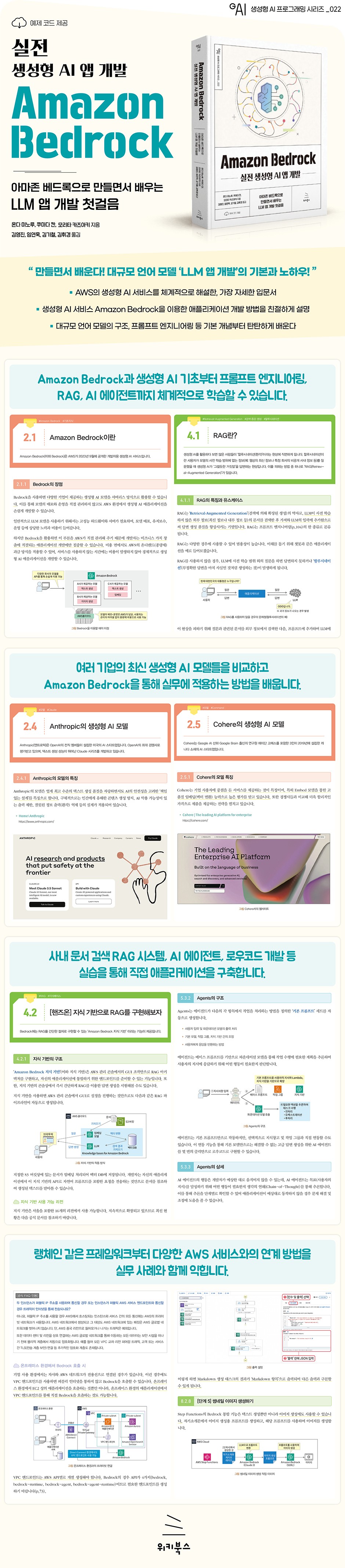 ¾Æ¸¶Á¸ º£µå·Ï(Amazon Bedrock)Àº AWSÀÇ °·ÂÇϰí À¯¿¬ÇÑ ±â¹Ý ¸ðµ¨(Foundation Model) ¼ºñ½ºÀÔ´Ï´Ù. ÀÌ Ã¥Àº ¾Æ¸¶Á¸ º£µå·ÏÀ» Ȱ¿ëÇÏ¿© »ý¼ºÇü AI ¾ÖÇø®ÄÉÀ̼ÇÀ» ½ÇÁ¦·Î ¼³°èÇÏ°í ±¸ÃàÇÏ´Â µ¥ ÇÊ¿äÇÑ ¸ðµç °ÍÀ» ´ã°í ÀÖ½À´Ï´Ù. ±âº»ÀûÀÎ AI Áö½ÄºÎÅÍ ½ÃÀÛÇÏ¿©, Bedrock ȯ°æ ¼³Á¤, ´Ù¾çÇÑ ¸ðµ¨ »ç¿ë¹ý, ½ÇÁ¦ ºñÁî´Ï½º¿¡ Àû¿ëÇÒ ¼ö ÀÖ´Â ¾ÖÇø®ÄÉÀÌ¼Ç ±¸Çö±îÁö ´Ü°èº°·Î ¾È³»ÇÕ´Ï´Ù.