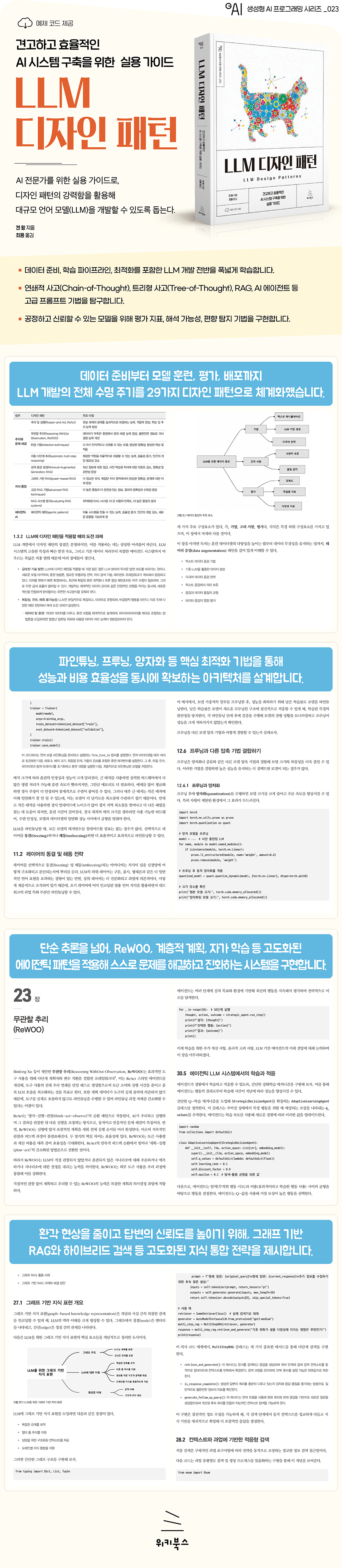 ÃâÆÇ»ç ¼Æò´ë±Ô¸ð µ¥ÀÌÅͼÂÀÇ Á¤Á¦, Áõ°, ÁÖ¼® ó¸® ¹æ¹ýºÎÅÍ ¸ðµâÇü ÈÆ·Ã ÆÄÀÌÇÁ¶óÀÎ ¼³°è, ÇÏÀÌÆÛÆÄ¶ó¹ÌÅÍ Æ©´×, ÇÁ·ç´×, ¾çÀÚȸ¦ ÅëÇÑ ¸ðµ¨ ÃÖÀûȱîÁö ´Ù·é´Ù. ¶ÇÇÑ °¢ Àå¿¡¼´Â Á¤±ÔÈ, üũÆ÷ÀÎÆÃ, ÆÄÀÎÆ©´×, ReAct(Ã߸® ¹× ½ÇÇà) µî °í±Þ ÇÁ·ÒÇÁÆÃ ±â¹ýÀ» »ìÆìº¸°í, ¹Ý¼º(reflection) ±â¹Ý Ãß·Ð, ´Ù´Ü°è Ã߸®, µµ±¸ Ȱ¿ëÀ» ±¸ÇöÇÏ´Â ¹æ¹ýÀ» ¼Ò°³ÇÑ´Ù. ÀÌ¿Í ÇÔ²² °Ë»ö Áõ° »ý¼º(RAG), ±×·¡ÇÁ ±â¹Ý °Ë»ö, ÇØ¼® °¡´É¼º, °øÁ¤¼º, Àΰ£ Çǵå¹é °ÈÇнÀ(RLHF) µîÀ» ÁßÁ¡ÀûÀ¸·Î ´Ù·ç¸ç, ±Ã±ØÀûÀ¸·Î ¿¡ÀÌÀüƽ LLM ½Ã½ºÅÛ ±¸ÃàÀ¸·Î À̾îÁø´Ù.